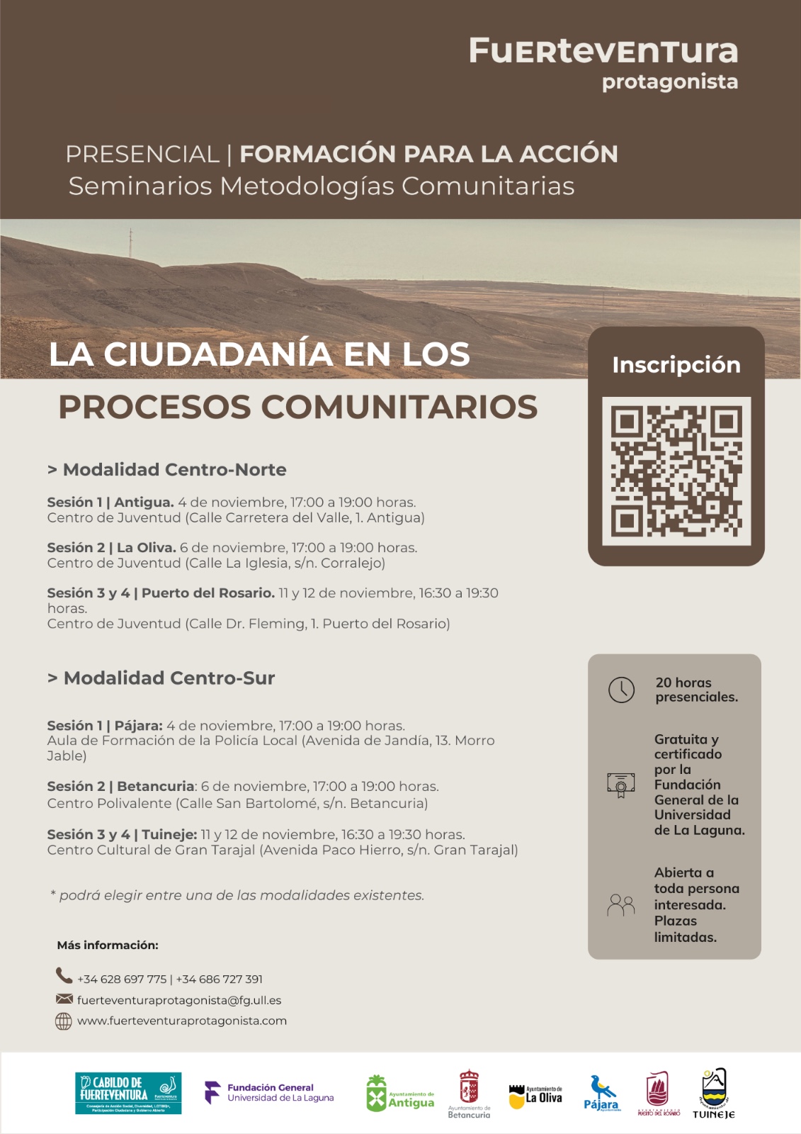 El proyecto ‘Fuerteventura Protagonista’, que impulsa la Consejería de Acción Social, Diversidad, LGTBIQ+, Participación Ciudadana y Gobierno Abierto del Cabildo, a través de Fundación General de la Universidad de La Laguna, continúa acercando la participación ciudadana en los procesos comunitarios a la población. Tras una serie de seminarios de metodologías comunitarias online, la próxima semana comienza con la formación presencial en las zonas norte, centro y sur de la Isla.
