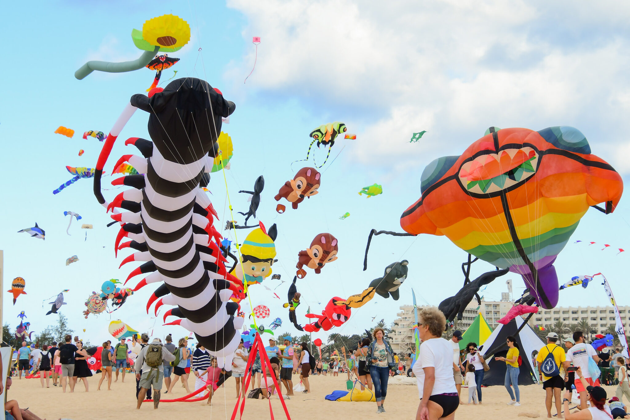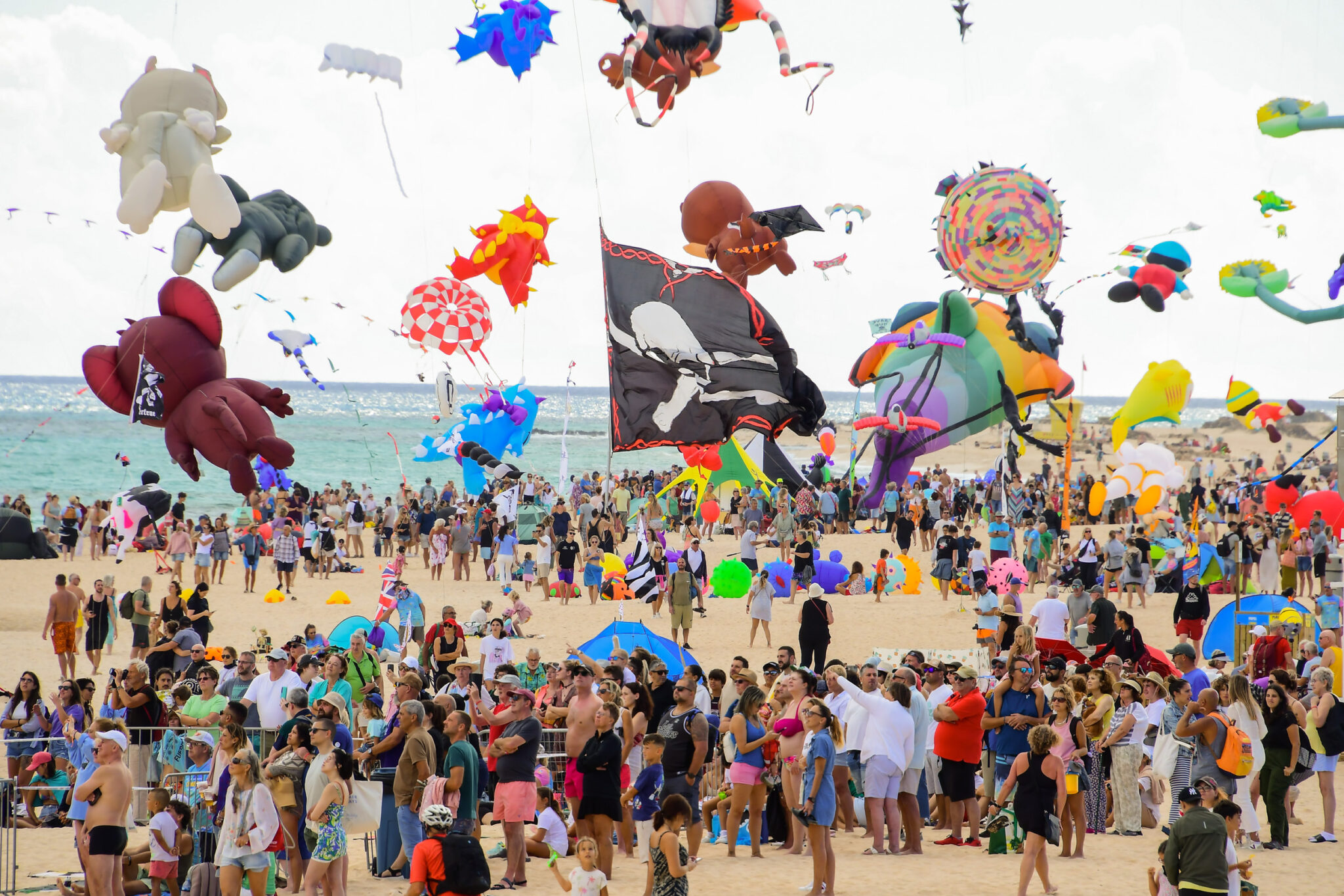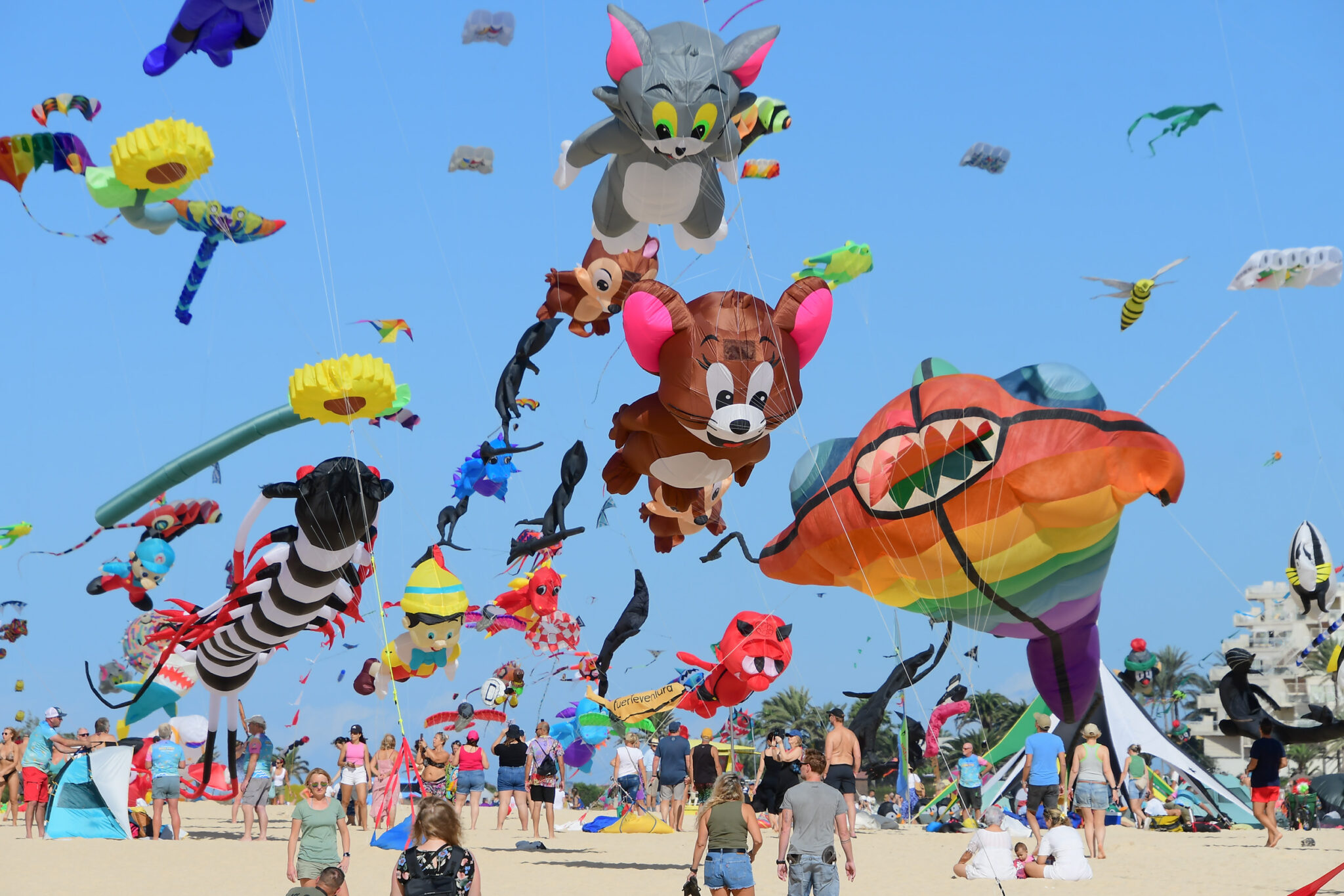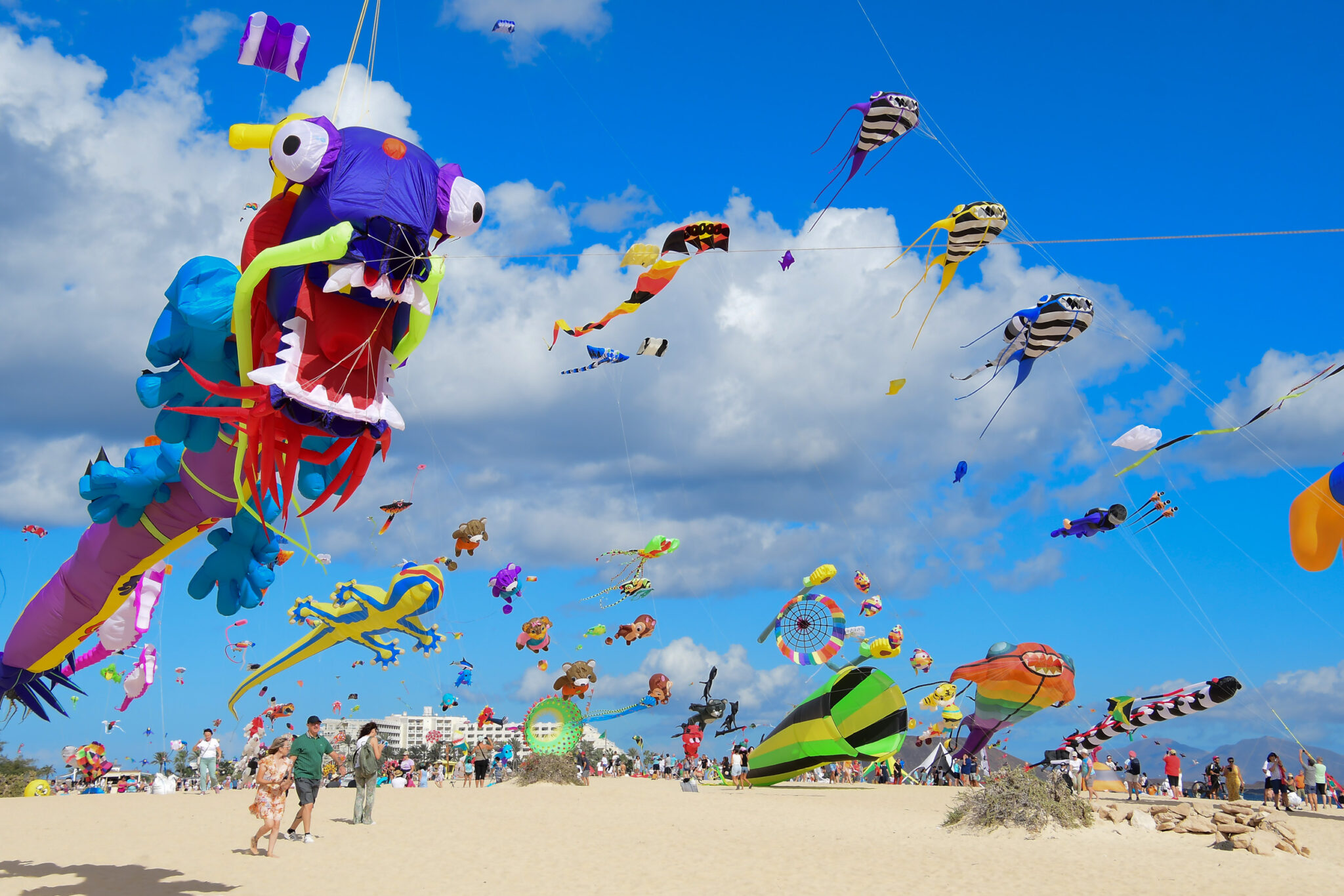 La combinación de los paisajes de dunas y la alta intensidad del viento convierten a Corralejo en un enclave único para el vuelo de cometas, atrayendo a participantes internacionales, especialmente desde países como Holanda, Alemania o Italia.