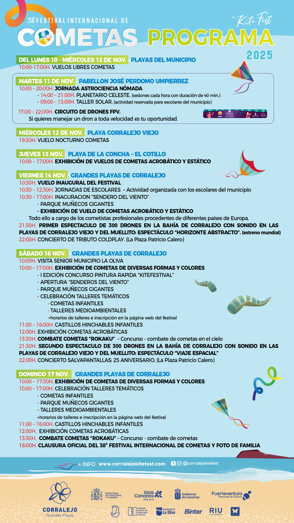Durante casi una semana, el norte de la isla se convertirá en un espectáculo visual sin precedentes con millares de cometas sobrevolando un Espacio Natural Protegido. La agenda incluye exhibiciones de vuelo, concursos, combates de cometas, talleres infantiles y medioambientales, espectáculos nocturnos y conciertos, ofreciendo así una programación pensada para todas las edades y públicos.