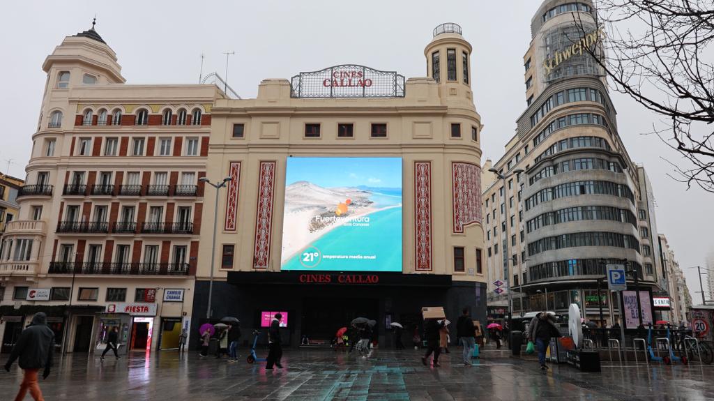 Desde el pasado día 15 de enero el destino turístico Fuerteventura está promocionándose en varias pantallas gigantes de la Plaza del Callao y la céntrica calle de Gran Vía, en Madrid, mostrando durante el día y la noche a los transeúntes del centro de la capital de España sugerentes imágenes de las playas y paisajes de la Isla e indicando nuestra temperatura media como contraste y reclamo en pleno invierno.