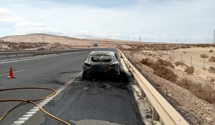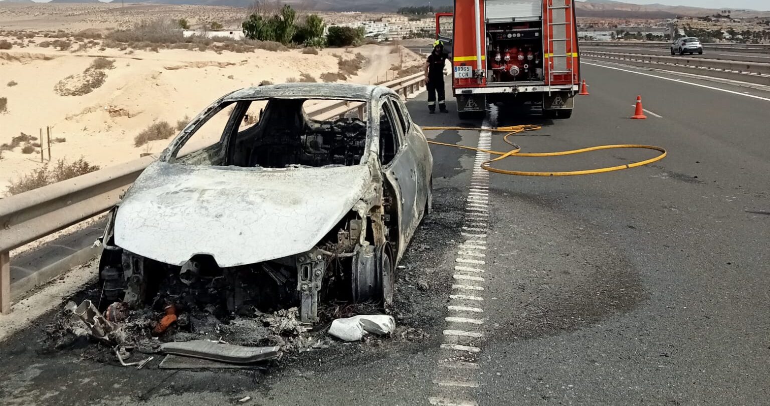 Alrededor de las 13:20 horas de este jueves, se declaró un incendio en un vehículo que se encontraba en el arcén por la autovía FV-2 en dirección a Morro Jable, a la altura de Costa Calma.