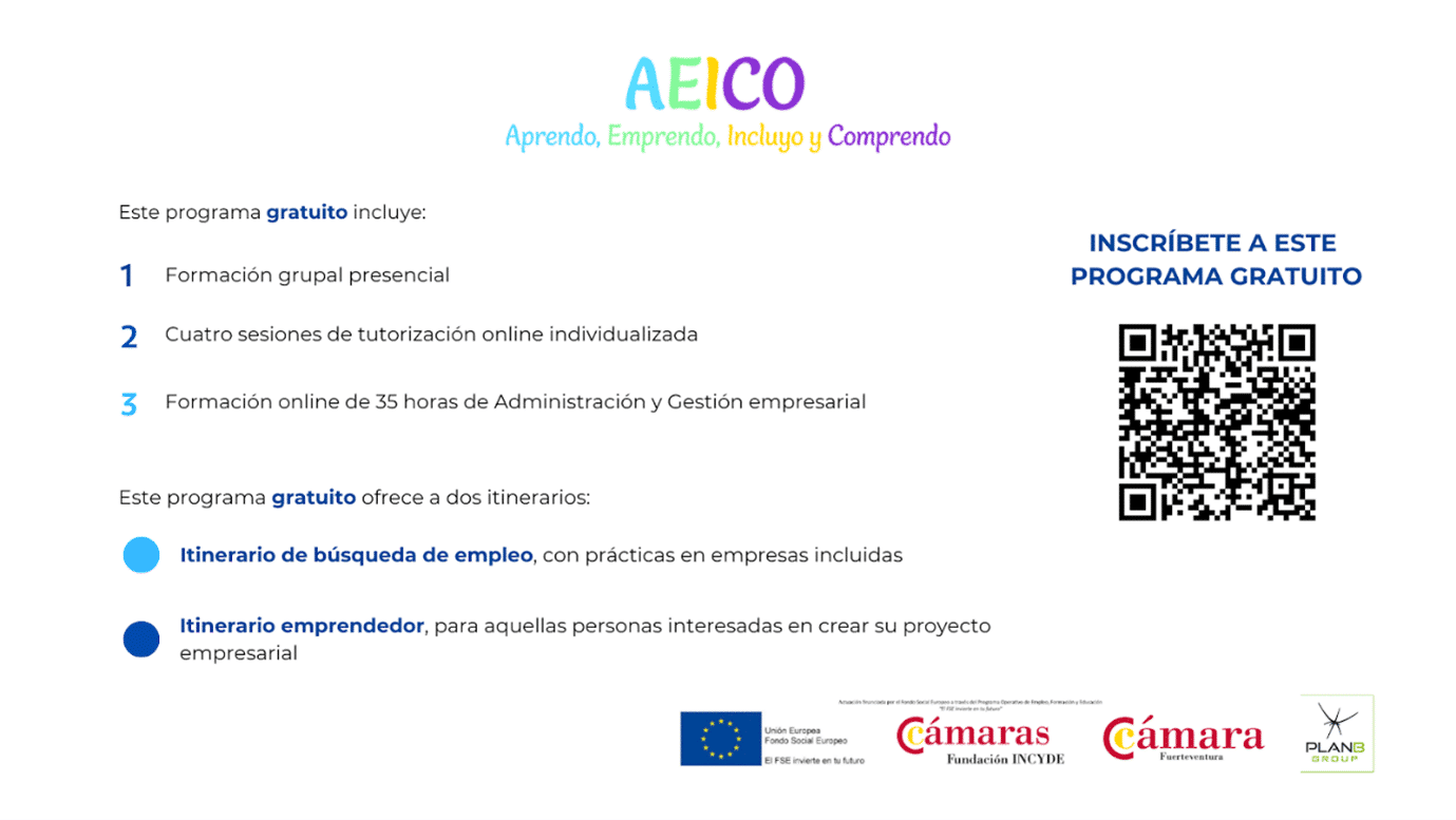 La Cámara de Comercio de Fuerteventura en colaboración con la Fundación INCYDE, presenta el Programa AEICO (Aprendo, Emprendo, Incluyo y Comprendo), una iniciativa respaldada por el Fondo Social Europeo que ofrece formación y asesoramiento personalizado destinado impulsar la empleabilidad y el emprendimiento de la ciudadanía local.