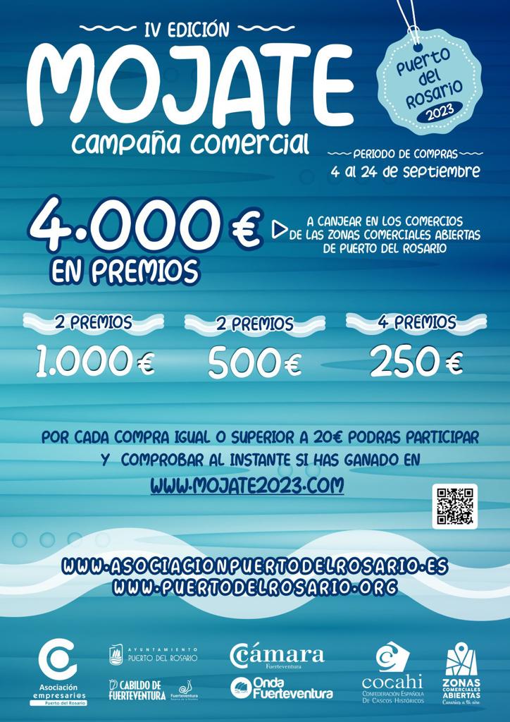 Una vez hecha la compra, el establecimiento entregará un cupón con el que el comprador podrá comprobar al instante si ha ganado alguno de los premios a través de la página web www.mojate2023.com . Los participantes podrán optar a dos premios de 1.000 euros, 2 premios de 500 euros y 4 premios de 250 euros, en total 4.000 euros en premios por comprar en el comercio local de Puerto del Rosario. Estos premios podrán ser canjeados entre el 27 de septiembre y el 10 de octubre.