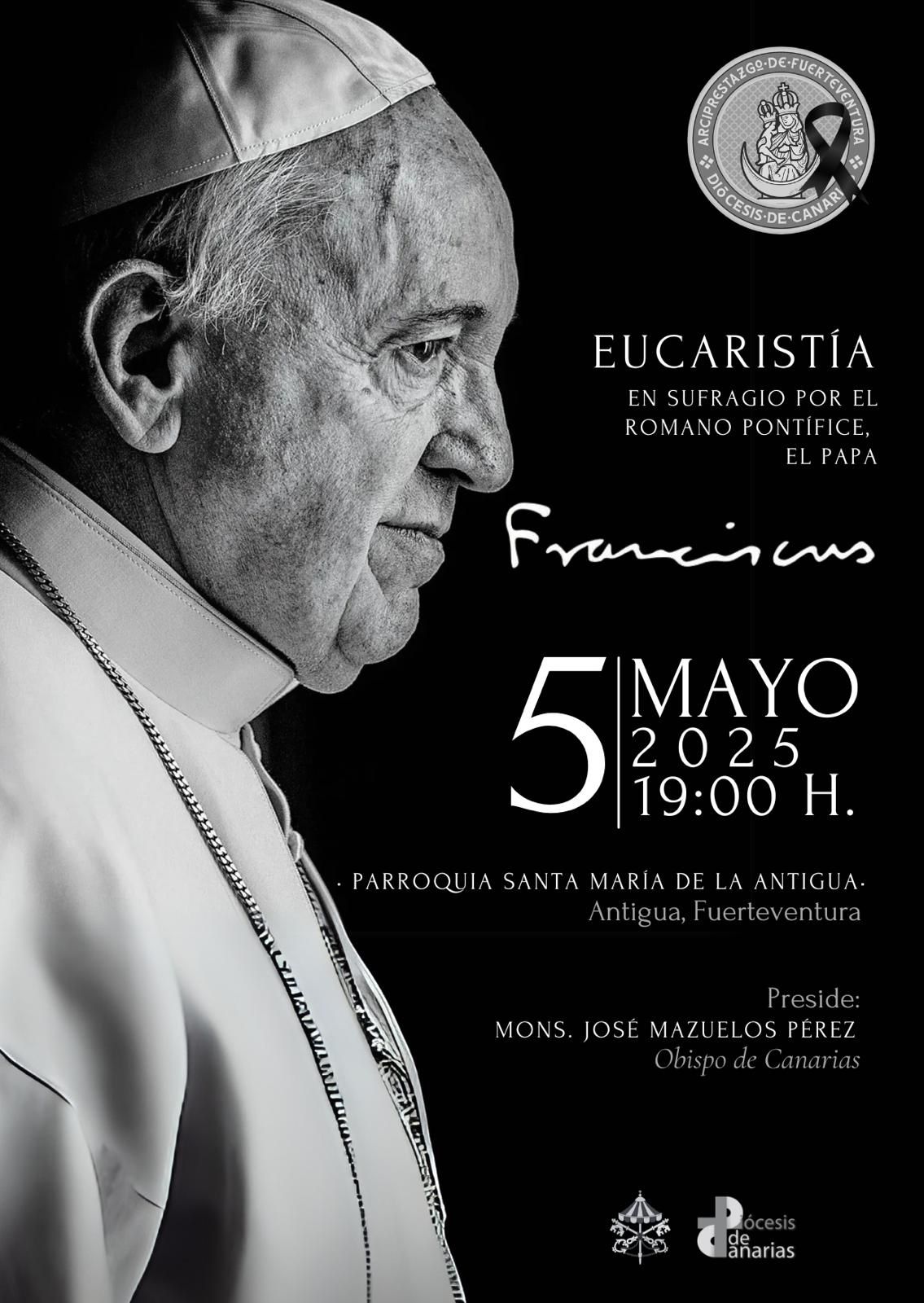 El próximo 5 de mayo de 2025, a las 19:00 horas, se celebrará una Eucaristía en sufragio por el Romano Pontífice, el Papa Francisco, en la Parroquia Santa María de La Antigua, ubicada en el municipio de Antigua, Fuerteventura.