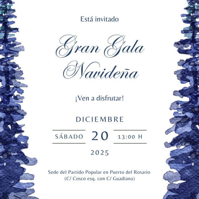 La tradicional Gala de Navidad del Partido Popular de Fuerteventura se celebrará manteniendo la misma hora (13:00 horas) y el mismo lugar (sede insular, en la calle Cosco esquina con calle Guadiana, en Puerto del Rosario). Tras la Gala se ofrecerá un brindis a los asistentes.