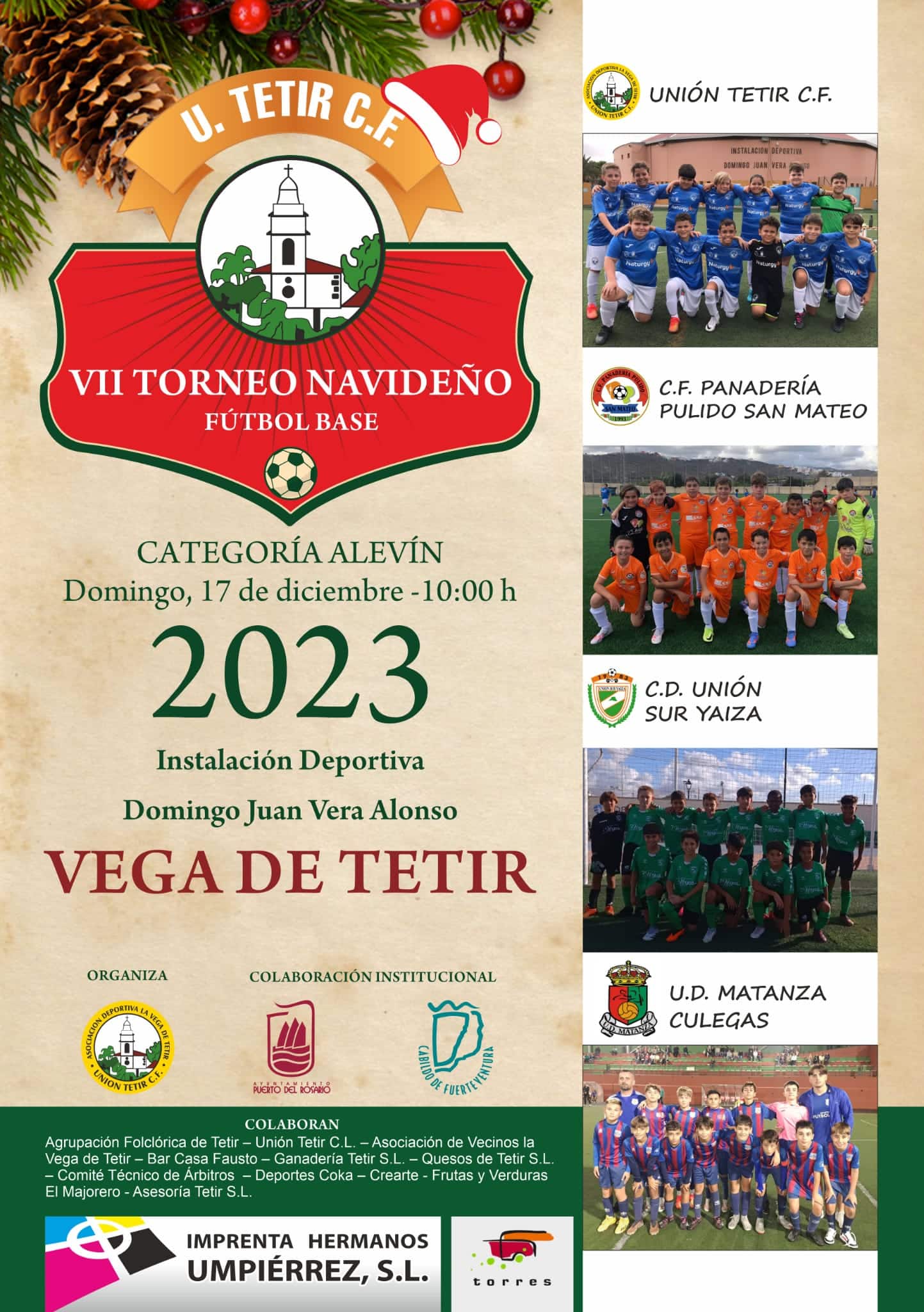 El Municipal Domingo Juan Vera Alonso de Tetir acogerá el domingo, 17 de diciembre, a partir de las 10:00 horas, el VII Torneo Navideño de Fútbol Base en Categoría Alevín. Este evento contará con la participación de equipos destacados del archipiélago: CF Panadería Pulido San Mateo, Unión Sur Yaiza, UD La Matanza y Unión Tetir CF.
