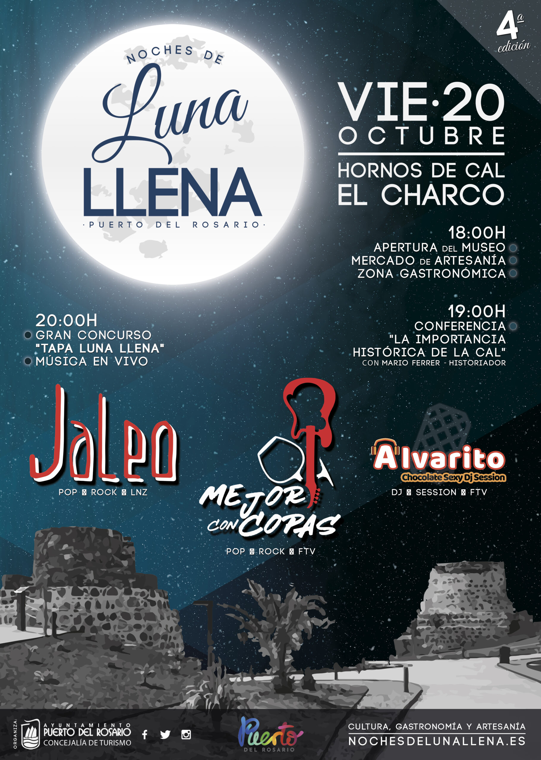 Para esta nueva edición se ha preparado un programa completo de actividades que darán comienzo a las 18:00 horas con la apertura del recinto, zona gastronómica y mercado de artesanía, así como la apertura del Centro de Interpretación de Los Hornos de Cal, todo ello amenizado con la música de ‘Alvarito de Chocolate Sexy Dj Session’.