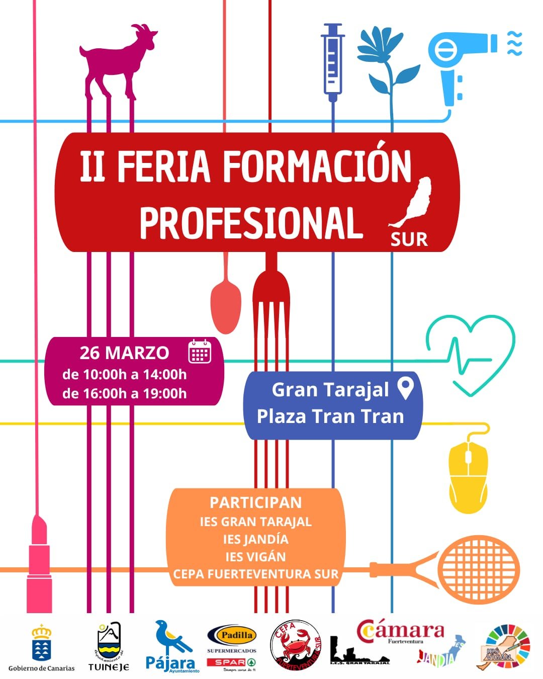 La jornada, que se desarrollará de 10:00 a 14:00 horas y de 16:00 a 19:00 horas, contará con stands informativos de diversas familias profesionales, como Hostelería y Turismo, Sanidad, Informática y Comunicaciones, Actividades Físicas y Deportivas, Administración y Gestión, Agraria, Servicios Socioculturales y a la Comunidad, e Imagen Personal, entre otras. A lo largo del día, los asistentes podrán participar en talleres prácticos, demostraciones en vivo y actividades interactivas diseñadas para mostrar las oportunidades laborales que ofrece la Formación Profesional en la isla.