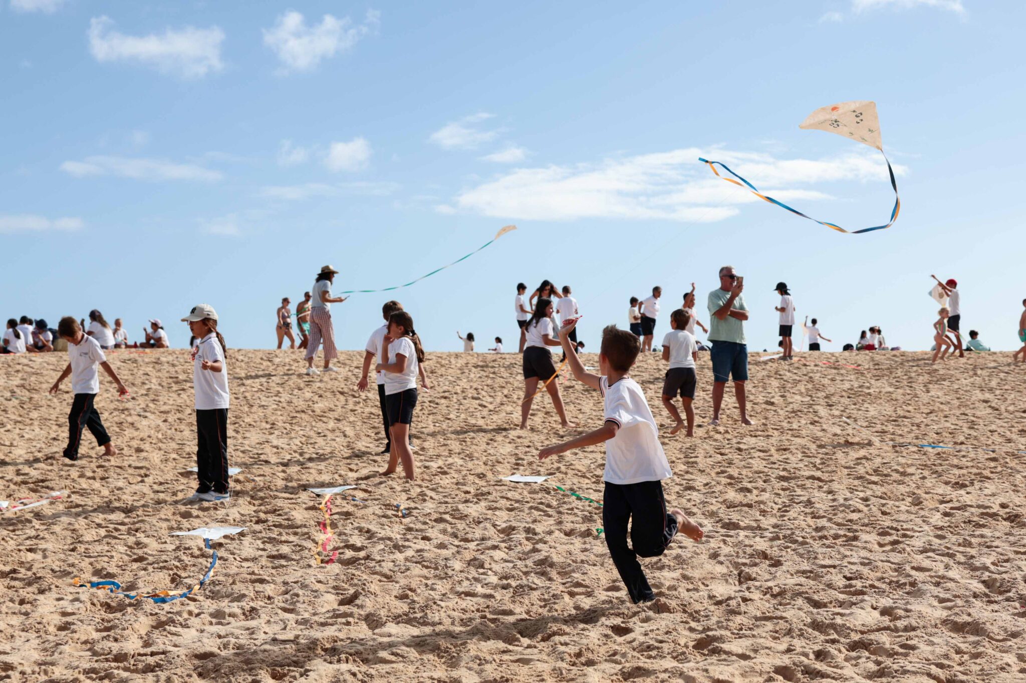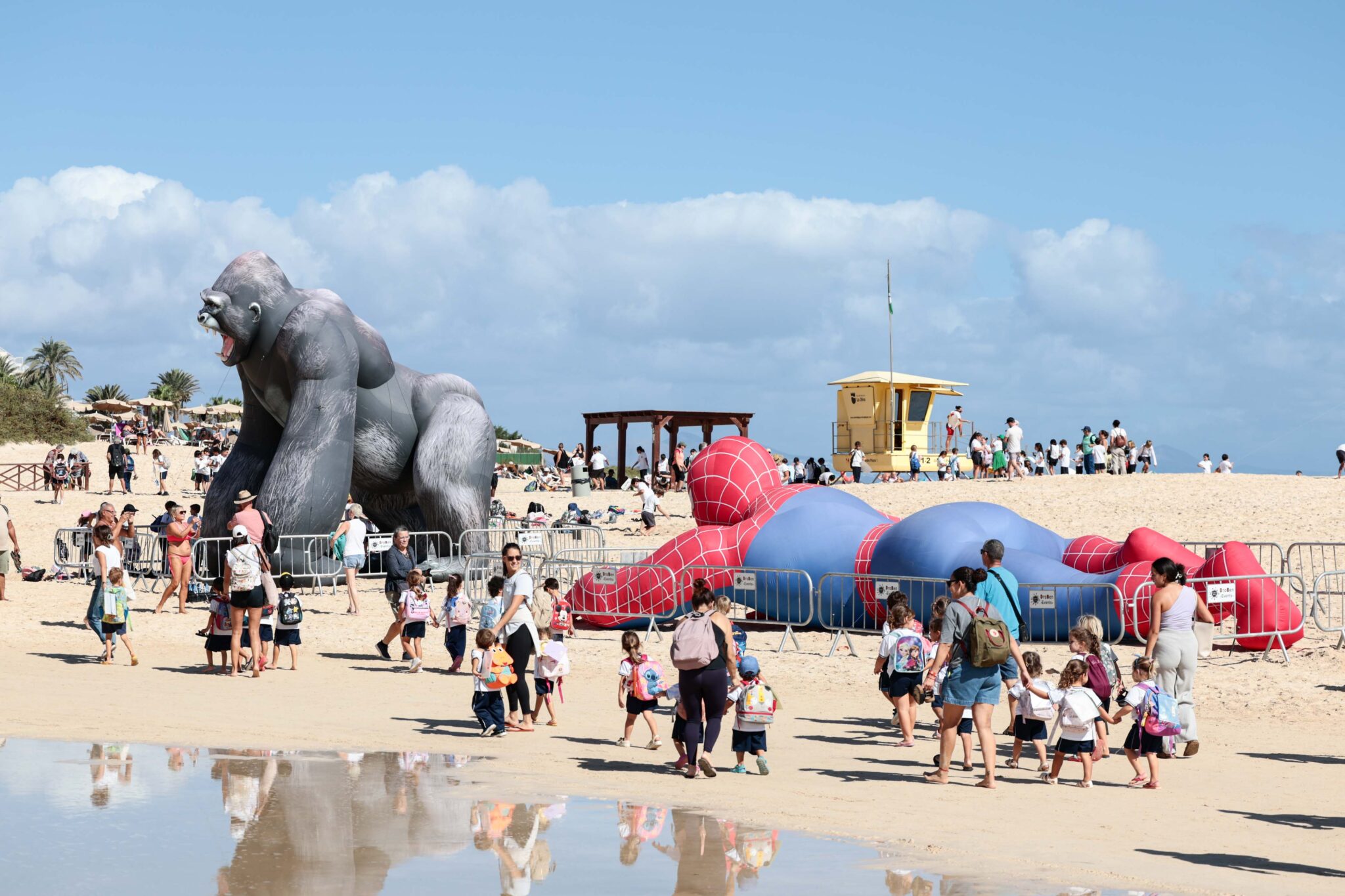 Cientos de escolares llegados de todos los colegios de infantil y primaria de La Oliva han participado también del día de hoy volando pequeñas cometas junto al mar. Por delante todo un fin de semana de exhibiciones tanto de cometas estáticas como acrobáticas, combates de cometas, talleres, concursos y una de las novedades de la edición, un parque de muñecos hinchables gigantes de más de 6 metros de altura, que han convertido a Spiderman, Batman y King Kong en los grandes protagonistas de la jornada.