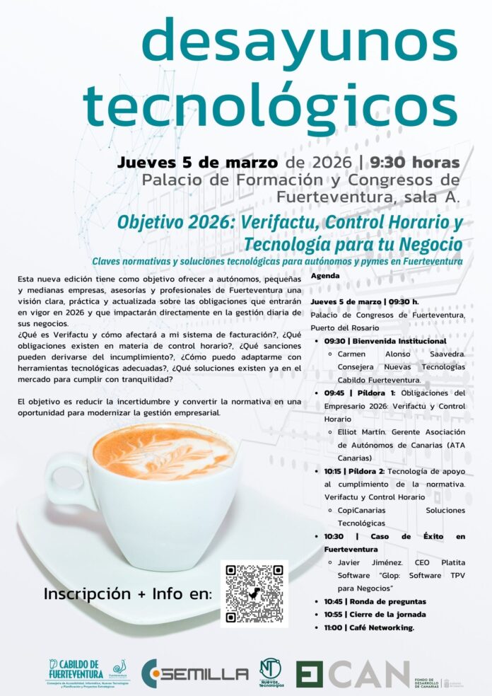 La jornada incluirá también un caso de éxito en la isla con la participación de Platita Software “Glop: Software TPV para Negocios”, que expondrá su experiencia en la implantación de soluciones tecnológicas orientadas al cumplimiento normativo y la modernización de los negocios.