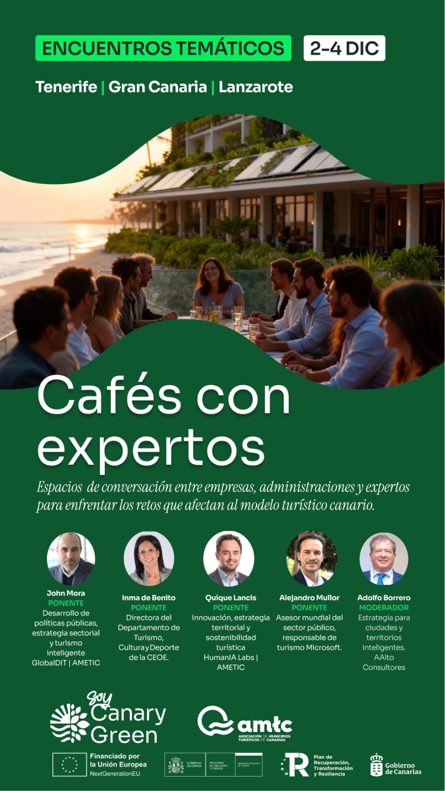 La Asociación de Municipios Turísticos de Canarias (AMTC) activa ‘Cafés con Expertos’, una serie de encuentros presenciales que forman parte del proyecto estratégico Soy Canary Green y cuyo objetivo es impulsar la sostenibilidad turística desde lo local a través del diálogo entre empresas, administraciones y especialistas. Estos espacios se desarrollan en diferentes semanas temáticas con el propósito de activar al tejido empresarial y facilitar la transición hacia un modelo turístico más consciente, conectado y sostenible, fortaleciendo la visión de un archipiélago que apuesta por la innovación y la gobernanza colaborativa.