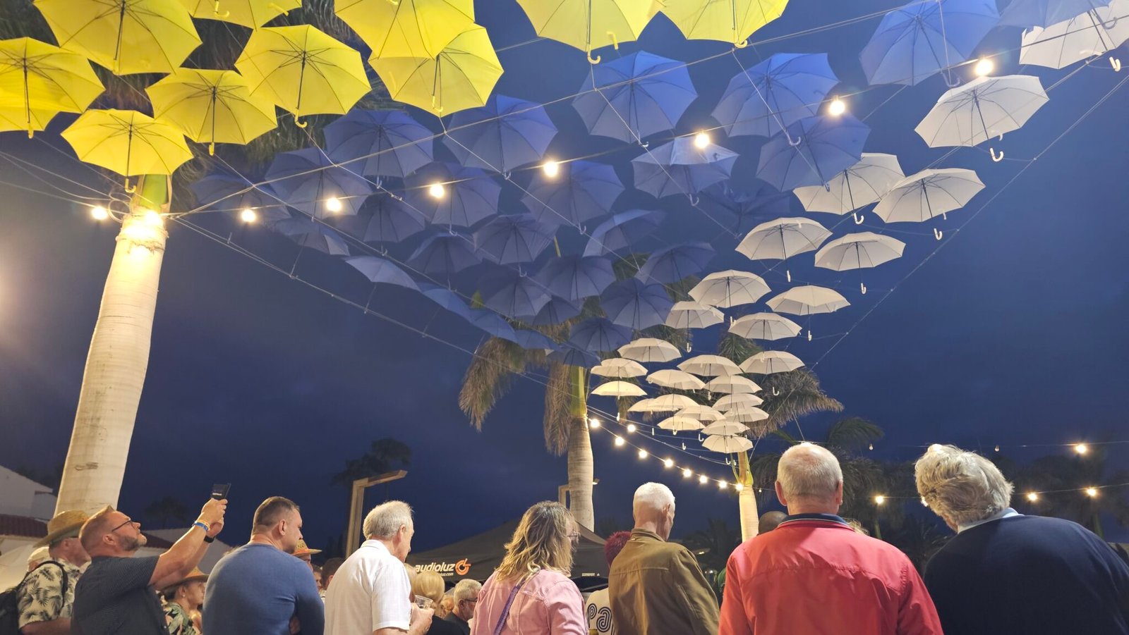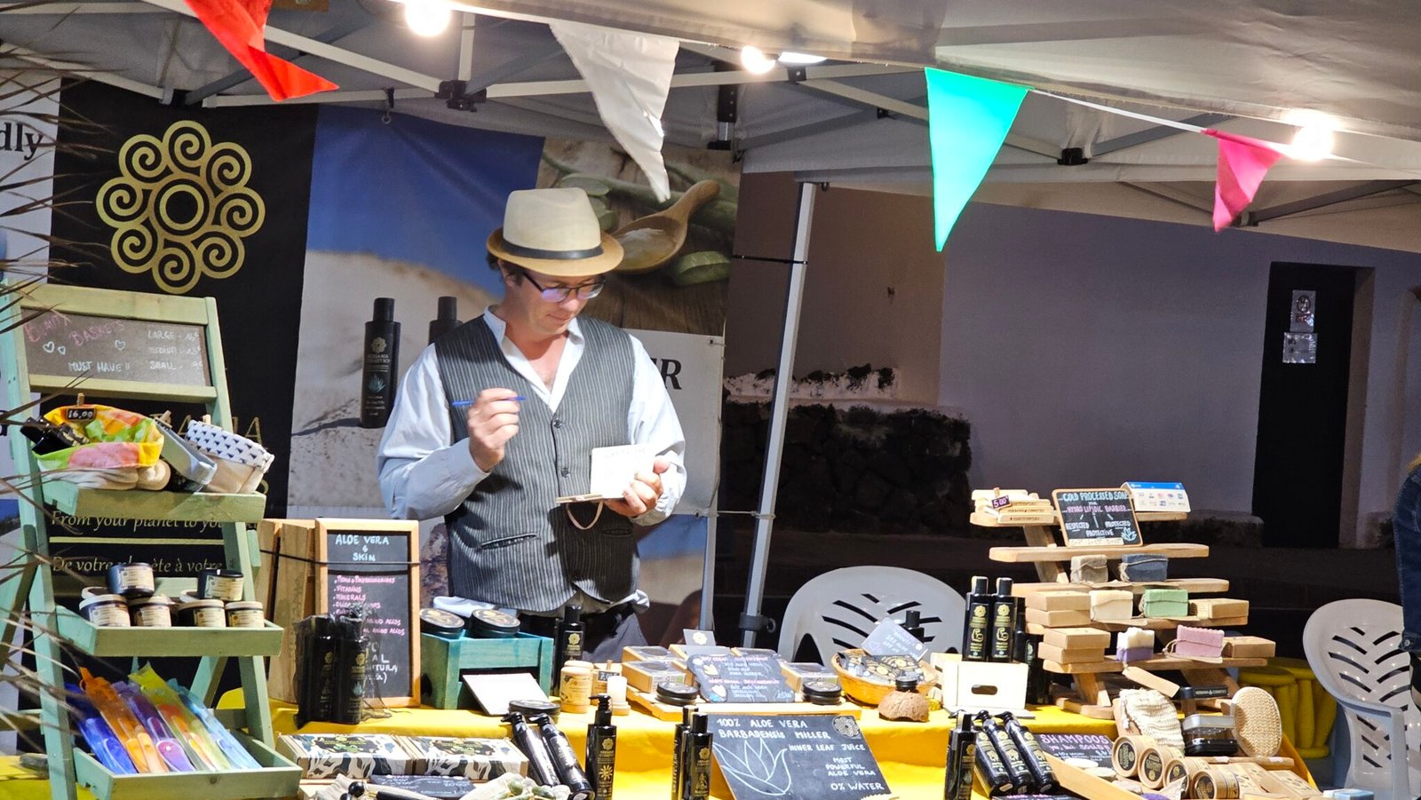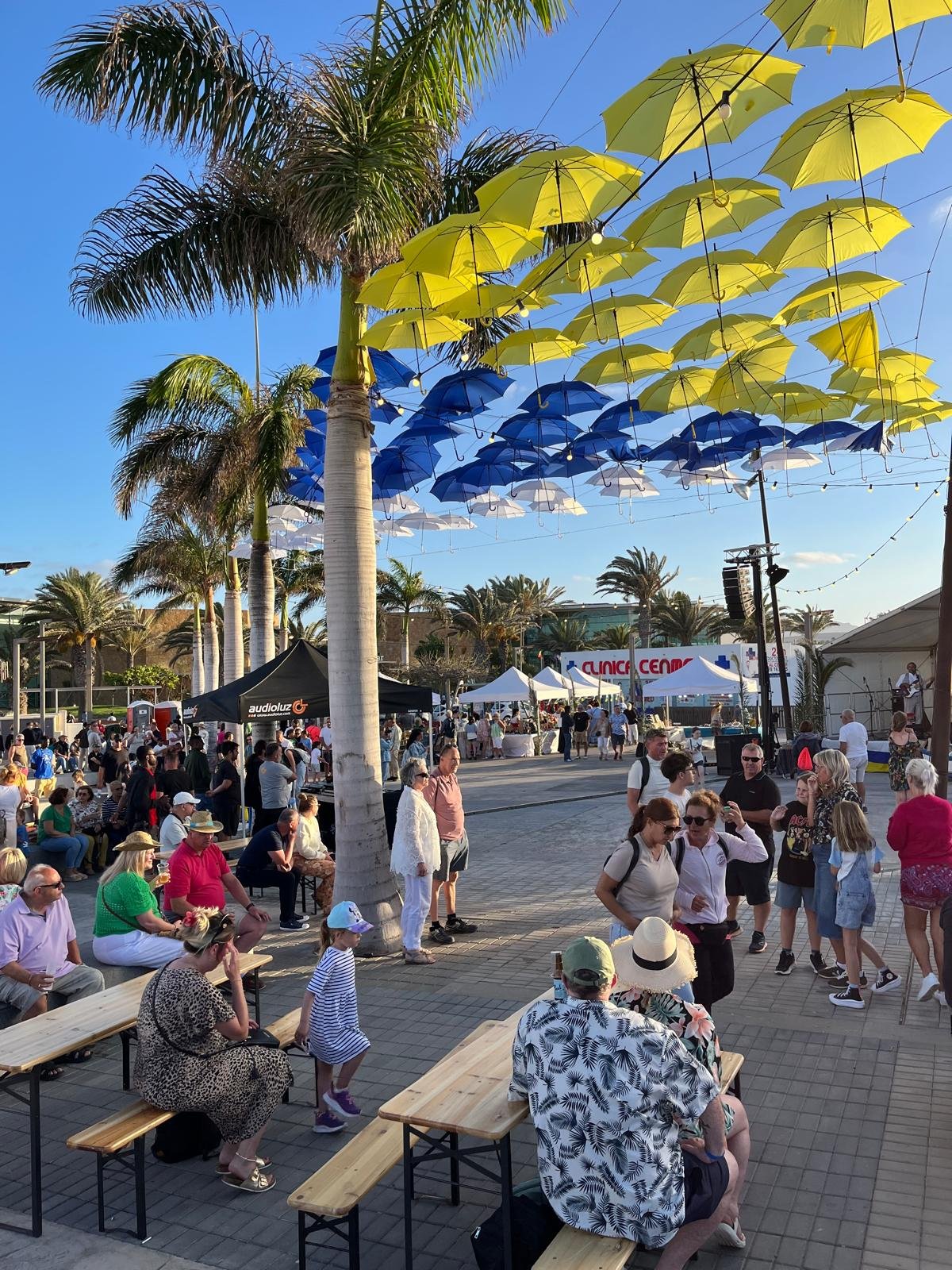 Un Mercadillo rodeaba la plaza de El Castillo cubierta por un cielo de paraguas con los colores canarios, bajo el que daba todas las explicaciones sobre origen y elaboración del gofio, el conocido Francisco el molinero, encantado de dar a degustar golosinas y pellas de gofio a quienes le rodeaban, algunos probando por primera vez el gofio.