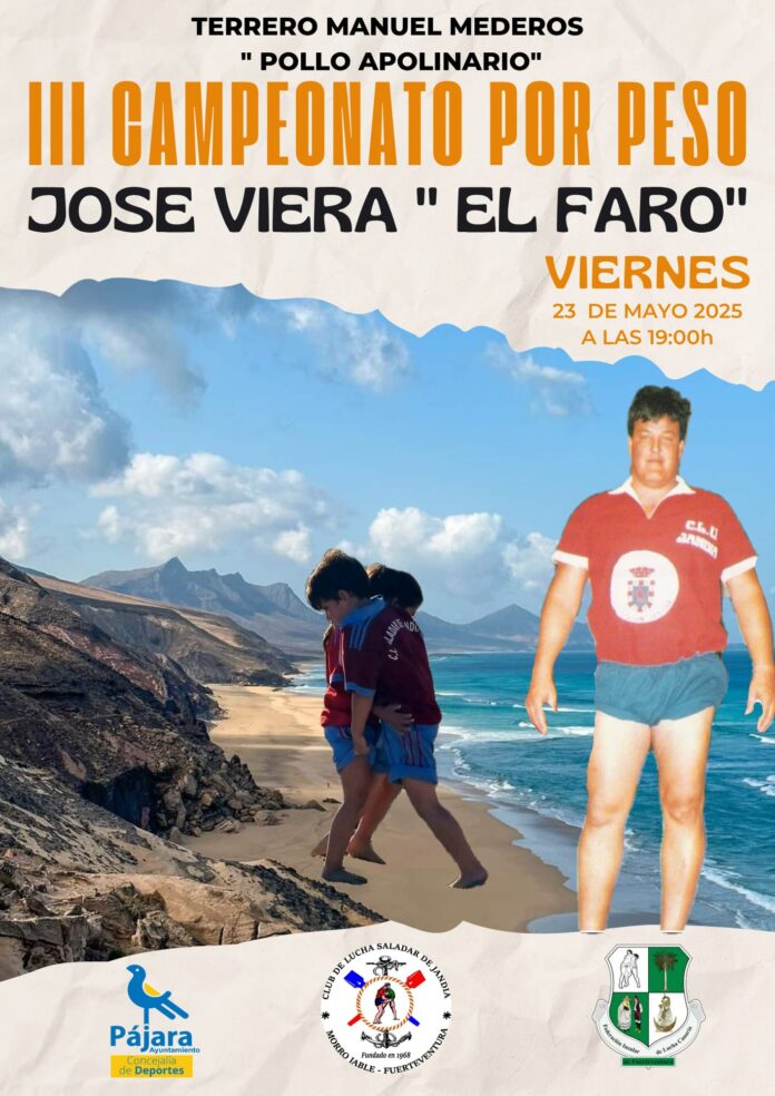 El próximo viernes 23 de mayo de 2025 a las 19:00 horas, el terrero Manuel Mederos “Pollo Apolinario”, en el municipio de Pájara, acogerá el III Campeonato por Peso “José Viera El Faro”, una destacada cita deportiva organizada por el Club de Lucha Saladar de Jandía, con el apoyo de la Concejalía de Deportes del Ayuntamiento de Pájara.