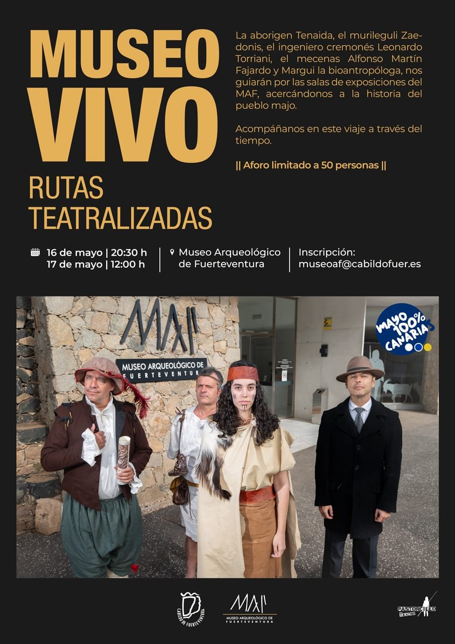 Finalmente, la ruta teatralizada ‘Museo Vivo’ se desarrollará también el viernes, 16 de mayo, a las 20.30 horas, para público general y se repetirá el sábado, 17 de mayo, a las 12.00 horas, dirigida en este segundo caso a un público familiar. Esta actividad sigue a una serie de personajes como la aborigen Tenaida, el mecenas Alfonso Martín Fajardo y Margui la bioantropóloga, que guiarán al público por las salas de exposiciones del museo.