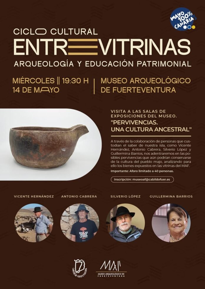 Como actividades abiertas al público general, el día 14 de mayo se inaugurará, a las 19.00 horas, la exposición ‘Aqueología de la mirada. La obra fotográfica de Luis Diego Cuscoy’. La muestra ofrece una mirada a la polifacética obra de Cuscoy, quien fuera director del Museo Arqueológico de Tenerife, a través de fotografías, audiovisuales y elementos en 3D. Los promotores de esta exposición son la Dirección General de Patrimonio Cultural de Canarias y el Instituto Canario de Desarrollo Cultural. A las 19.30 horas, se dará inicio a una nueva sesión del Ciclo Cultural Entre Vitrinas titulado ‘Pervivencias, una cultura ancestral’, con la participación de expertos que custodian el saber de Fuerteventura como Vicente Hernández, Antonio Cabrera, Silverio López y Guillermina Barrios.