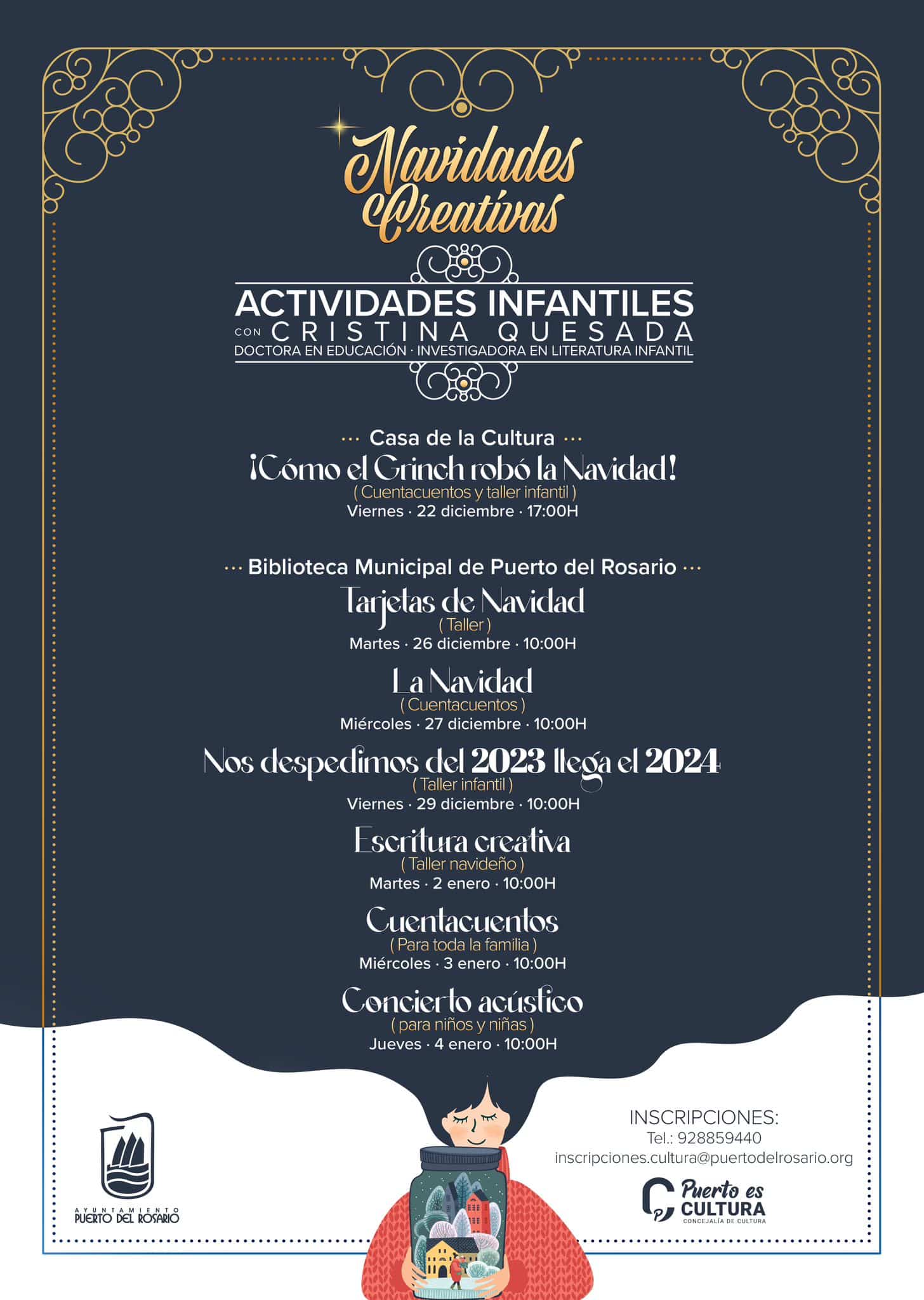 El resto de las actividades se desarrollarán en la Biblioteca Municipal e incluirán un taller de tarjetas de Navidad, el cuentacuentos ‘La Navidad’, talleres de despedida del 2023 y bienvenida al 2024, escritura creativa, así como un cuentacuentos para toda la familia. El broche final será el Concierto Acústico para niños y niñas el jueves, 4 de enero, a las 10:00 horas.