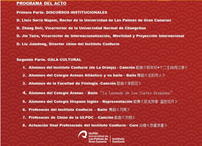 La celebración del Año del Dragón se inicia con un acto institucional en el que intervienen el Rector de la ULPGC, Lluís Serra, el Vicerrector de Internacionalización, Movilidad y Proyección Internacional, y Director español del Instituto Confucio, Jin Taira, y el Director chino de esta entidad, Liu Jiandong, así como el Vicerrector de la Universidad Normal de Changchun, Zhang Deli.