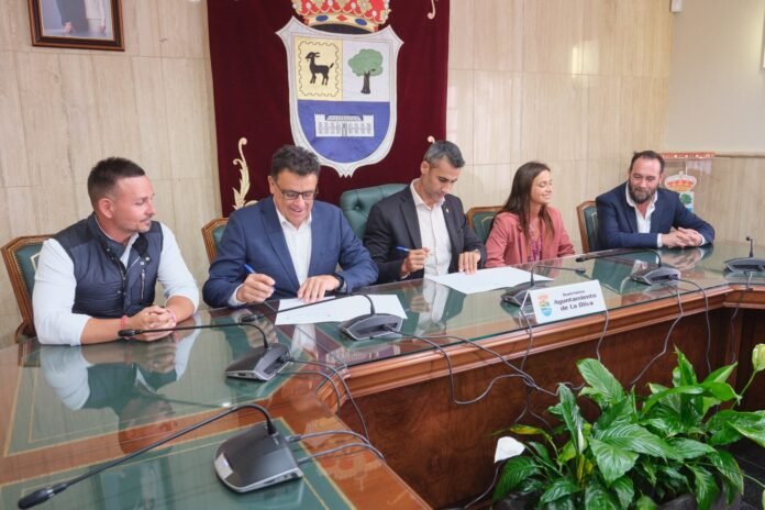 El consejero de Política Territorial del Gobierno de Canarias, Manuel Miranda, y el alcalde de La Oliva, Isaí Blanco, firmaron esta mañana el convenio que permitirá desbloquear las obras de saneamiento de El Cotillo, un proyecto paralizado desde el año 2021 por problemas administrativos en su ejecución.