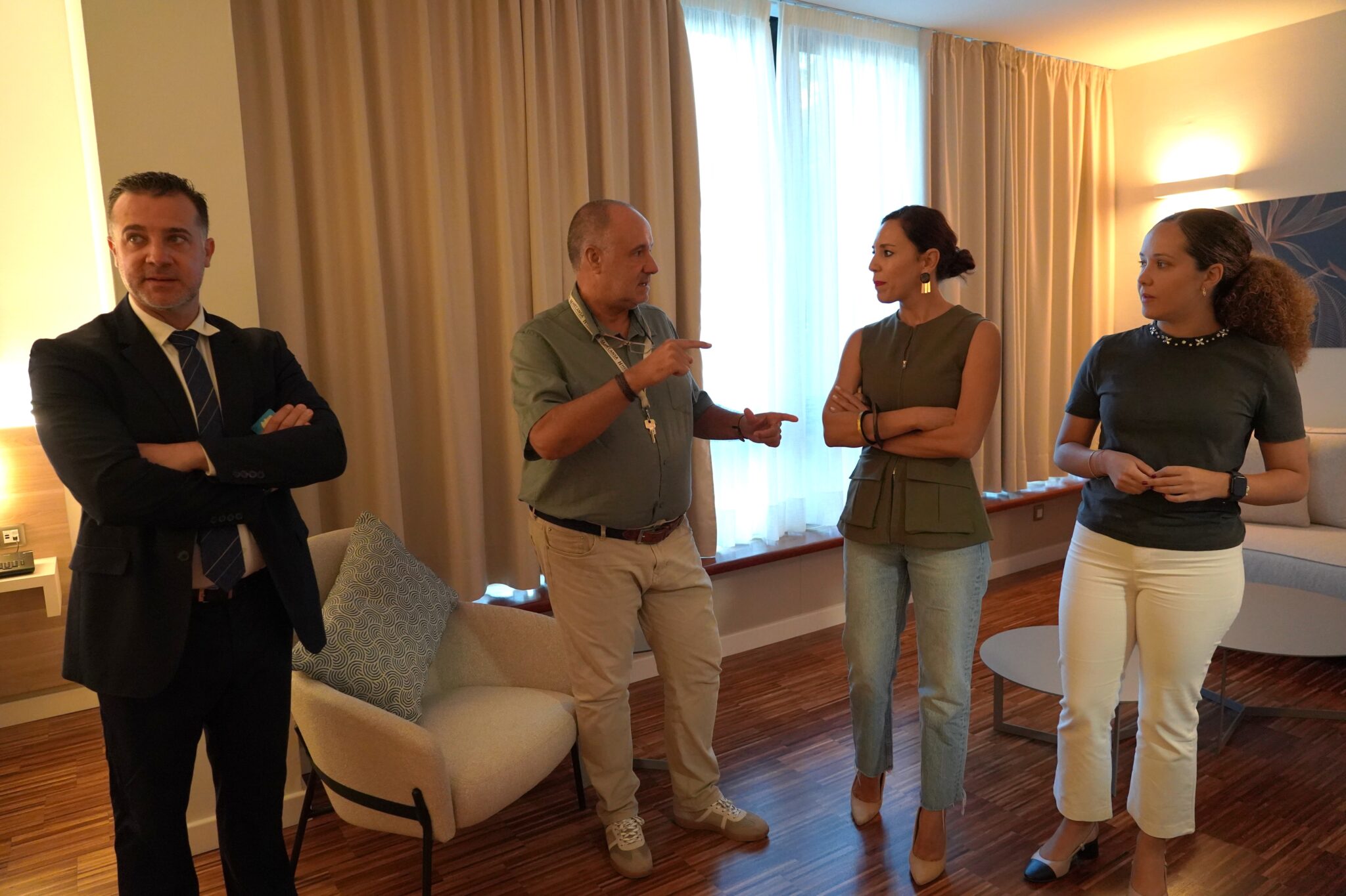 La titular del Departamento de Turismo y Empleo estuvo acompañada por la consejera delegada de Hecansa, Paola Plasencia; el director del Hotel Escuela Santa Cruz, Javier Ruiz, y el jefe de Mantenimiento, Orlando Chinea.