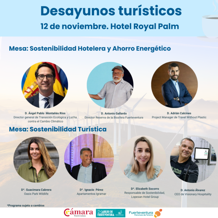 La sostenibilidad será la protagonista de la jornada en el segundo Desayuno Turístico que organiza la Cámara de Comercio con el patronato de Turismo de Fuerteventura el próximo 12 de noviembre. En esta ocasión, el organismo cameral celebrará el acto en la localidad de Morro Jable, con el objetivo de acercar estos eventos a todos los lugares de la isla. La jornada se dividirá en dos mesas de expertos, que tratarán diversos temas relacionados con la sostenibilidad turística y hotelera, en busca de un modelo de isla sostenible para sus habitantes y visitantes.