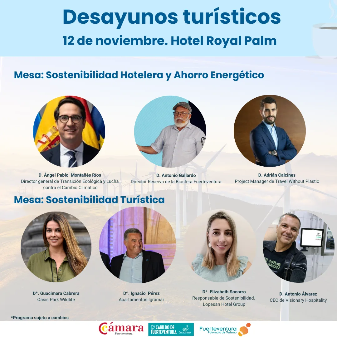 La segunda parte del evento estará enfocada en la sostenibilidad turística, y la mesa estará compuesta por Dª. Guacimara Cabrera, gerente del Oasis Park Wildlife, Dº. Ignacio Pérez, de los Apartamentos Igramar, Dª. Elizabeth Socorro, responsable de Sostenibilidad de Lopesan Hotel Group y Dº. Antonio Álvarez, CEO de Visionary Hospitality. Ambas mesas debatirán las principales problemáticas, así como las posibles soluciones y alternativas que puedan llevar al sector turístico de la isla de Fuerteventura hacia un modelo más sostenible. Las inscripciones son gratuitas, y se realizan a través del correo: turismo@camarafuerteventura.org