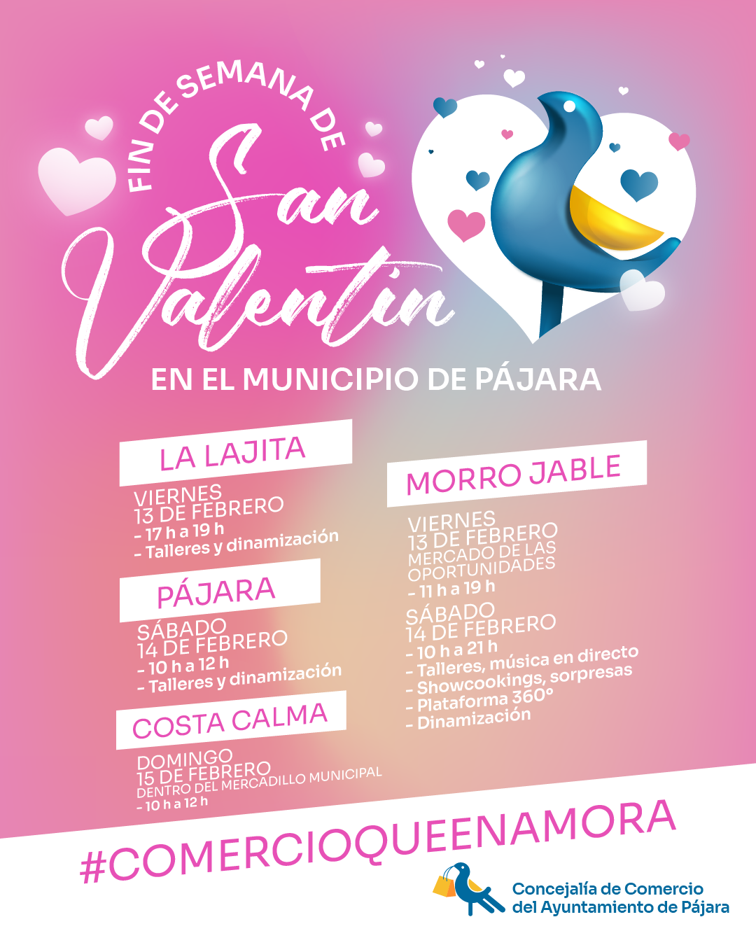 El Ayuntamiento de Pájara pone en marcha la campaña ‘Comercio que enamora’, una iniciativa que ofrece talleres y actividades dinamizadoras, dirigida a todas las edades, para celebrar San Valentín. Los diferentes eventos tendrán lugar desde mañana viernes, 13 de febrero, hasta este domingo, 15 de febrero, en La Lajita, Pájara, Costa Calma y Morro Jable.