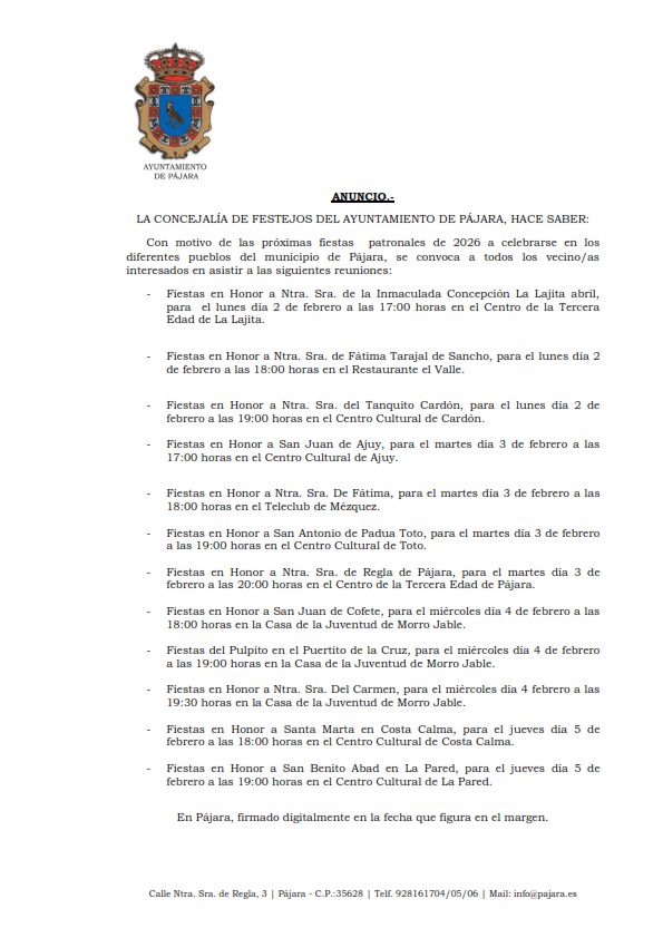 La Concejalía de Festejos del Ayuntamiento de Pájara ha anunciado una serie de reuniones informativas abiertas a los vecinos y vecinas de los distintos pueblos del municipio, con el objetivo de coordinar la organización de las fiestas patronales de 2026.
