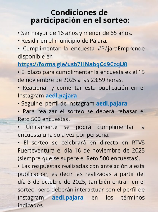 El Ayuntamiento de Pájara anima a la ciudadanía a formar parte de la encuesta #PájaraEmprende, una iniciativa para recoger ideas que impulsen el emprendimiento local. Entre quienes participen se sorteará un atractivo pack con: