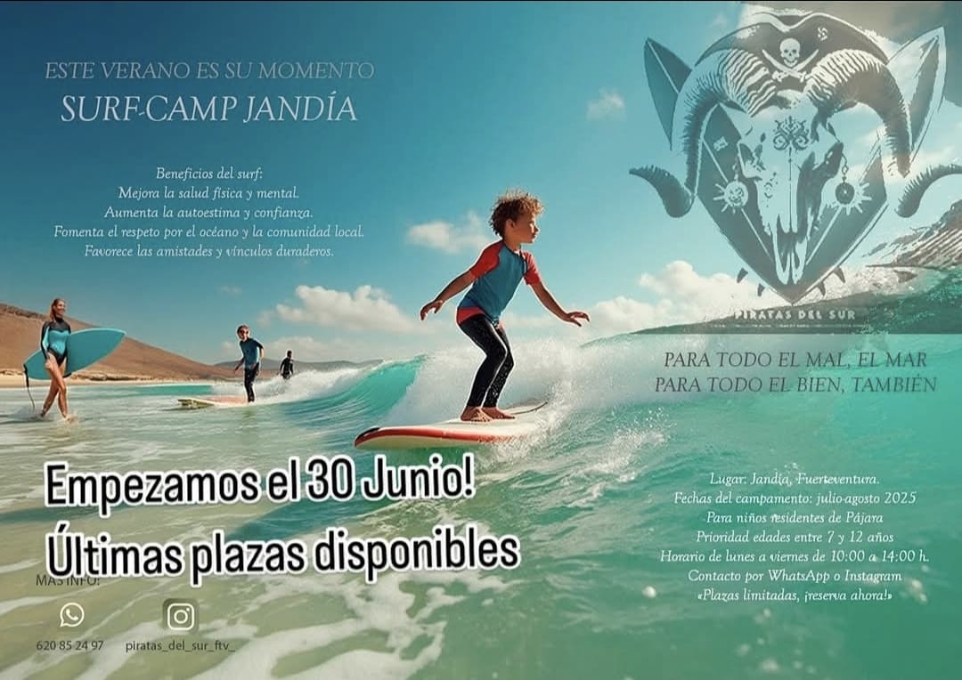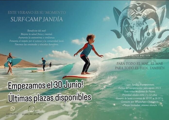 Bajo el lema “Para todo el mal, el mar. Para todo el bien, también”, la asociación Piratas del Sur vuelve este verano con una nueva edición de su Surf-Camp Jandía, una experiencia pensada para niños y niñas residentes en Pájara, con edades entre los 7 y 12 años.
