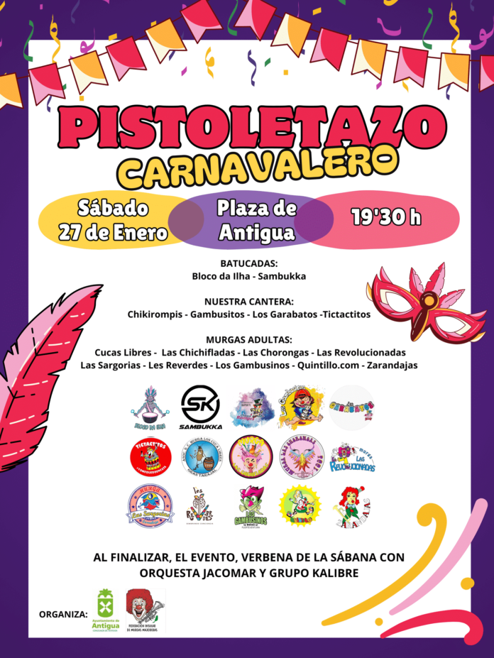 La concejalía de Festejos, explica el concejal de área, Agustín G. Rodríguez, organiza junto con la Federación Insular de Murgas, el Pistoletazo Carnavalero, en la plaza de Antigua este sábado 27 de enero a las 19:30 horas, con la participación de las Batucadas Bloco da Ilha, Sambukka, y la cantera de murgas infantiles de la isla, como Chikirompis, Gambusinos, Los Garabatos y Tictactitos, a los que seguirán las murgas más experimentadas como Cucas Libres, Las Chichifladas, Las Chorongas, Las Revolucionadas, Las Sargorias, Les Reverdes, Los Gambusinos, Quintillo.com y Zarandajas.