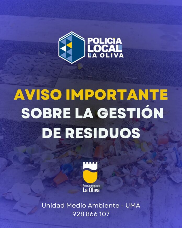 El Ayuntamiento de La Oliva, a través de la Policía Local, Medio Ambiente y Limpieza, lanza una campaña informativa que pretende concienciar sobre la ordenanza municipal de residuos a la ciudadanía del municipio. Así pues, la Unidad de Medio Ambiente de la Policía Local, en coordinación con las Concejalías de Medio Ambiente, que gestiona David Fajardo, y la Concejalía de Limpieza, que dirige Rubén González, dan a conocer los diferentes puntos sobre deberes y prohibiciones que contempla esta ordenanza con el fin de mantener el municipio cuidado y limpio.