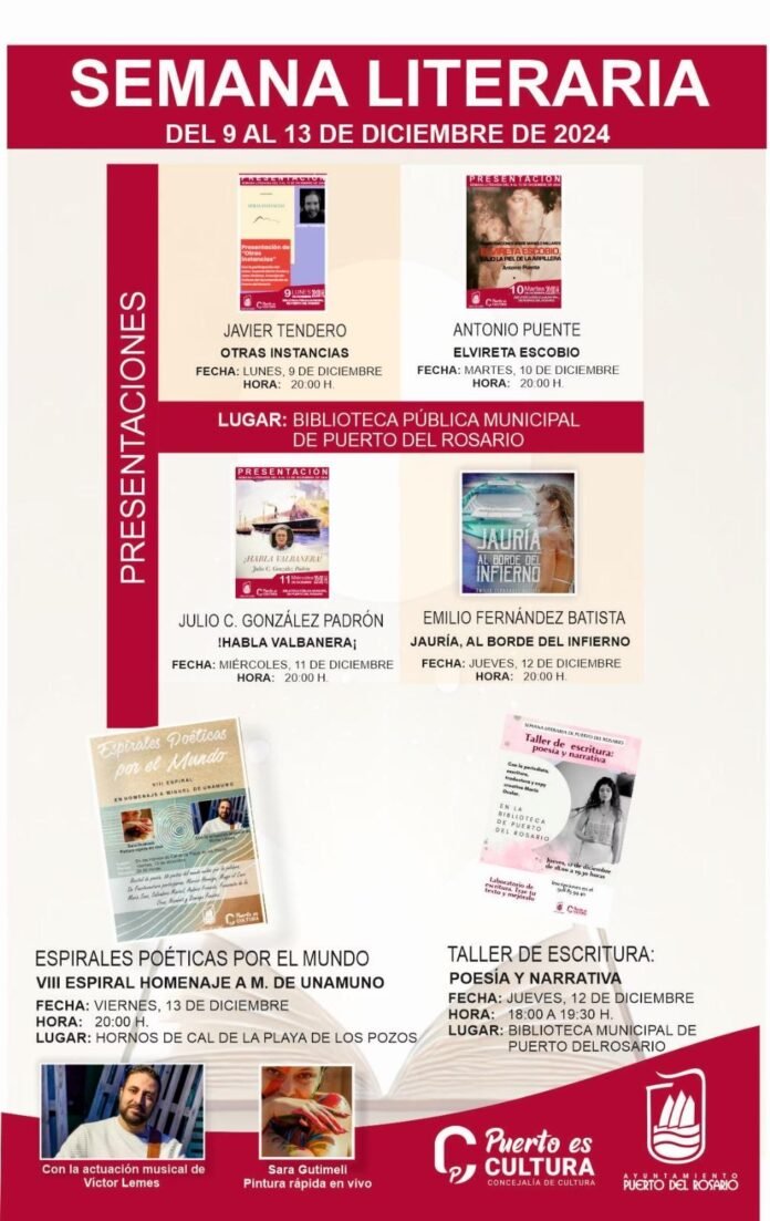 La Semana Literaria de Puerto del Rosario, organizada por el Ayuntamiento de Puerto del Rosario a través de la Concejalía de Cultura, llenará de letras y creatividad la ciudad del 9 al 13 de diciembre. Este evento cultural contará con presentaciones de libros, talleres de escritura, cuentacuentos y recitales, culminando con el esperado acto de clausura, la VIII ‘Espirales Poéticas por el Mundo’, en homenaje a Miguel de Unamuno.