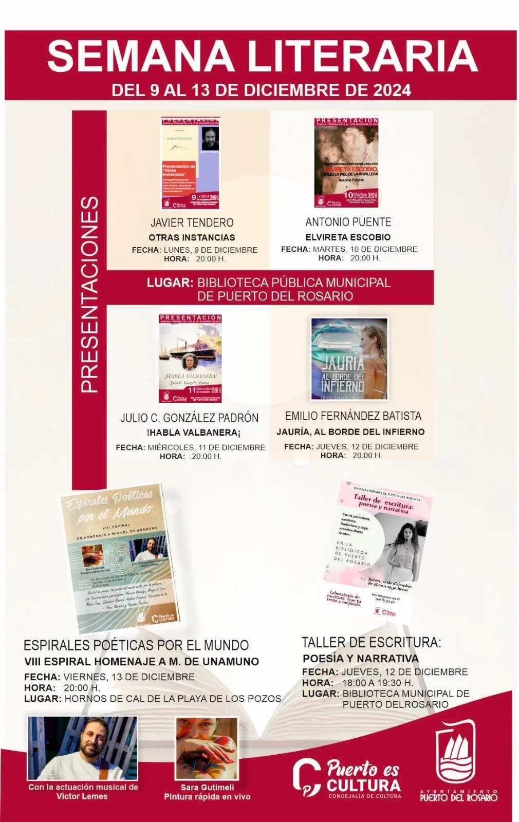 El programa comenzará el lunes, 9 de diciembre, en la Biblioteca Pública Municipal con la presentación del libro ‘Otras instancias’ de Javier Tendero, seguido el martes, día 10, por la obra ‘Elvireta Escobio’ de Antonio Puente. Durante la semana, escritores como Julio C. González Padrón y Emilio Fernández Batista presentarán sus libros, aportando una gran diversidad de estilos y temáticas.