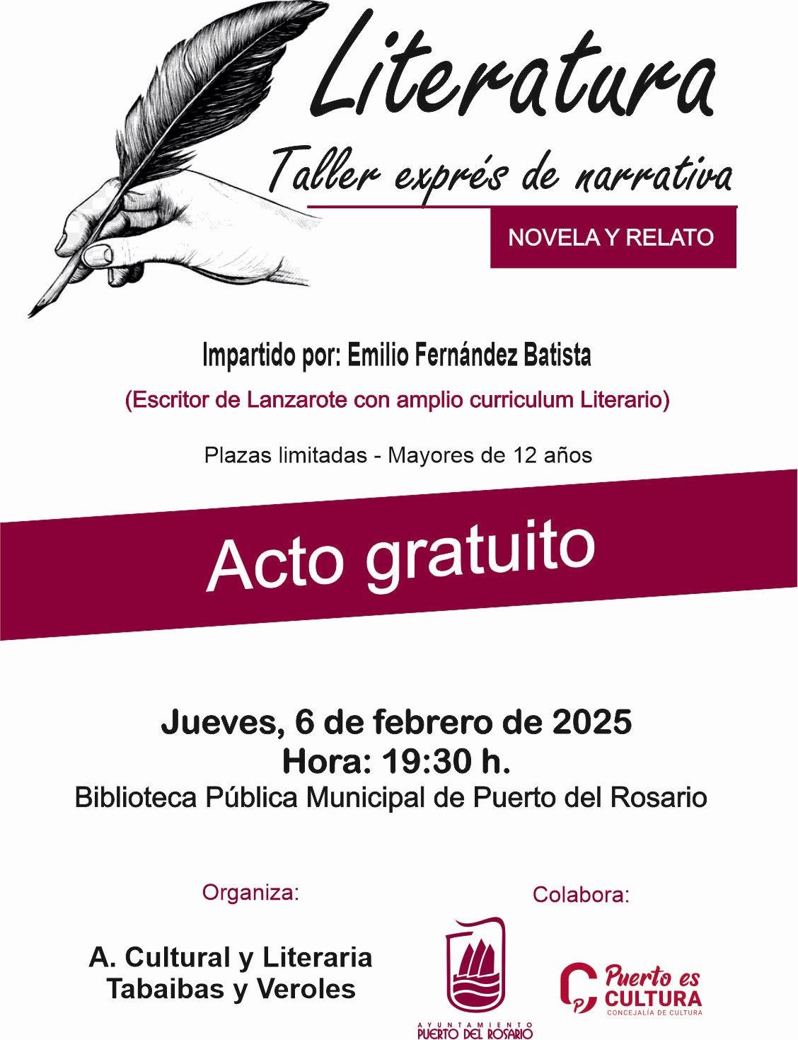 El jueves, 6 de febrero, a las 19:30 horas, tendrá lugar el Taller exprés de narrativa ‘Novela y Relato’, que será impartido por el escritor lanzaroteño Emilio Fernández Batista, reconocido por su amplia trayectoria literaria. Este taller, dirigido a mayores de 12 años, brindará a los participantes la oportunidad de desarrollar sus habilidades narrativas en un espacio creativo e inspirador. La actividad es gratuita, aunque las plazas son limitadas, por lo que se recomienda llegar con puntualidad.