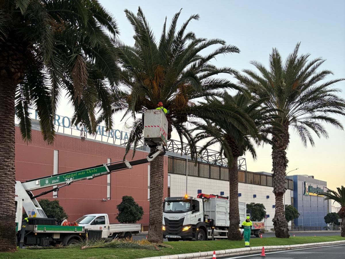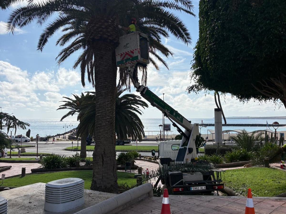 El Ayuntamiento de Puerto del Rosario continúa desarrollando trabajos de mantenimiento y cuidado de las zonas verdes del municipio, centrados en la poda de palmeras y la limpieza de malas hierbas en diferentes enclaves estratégicos de la capital.