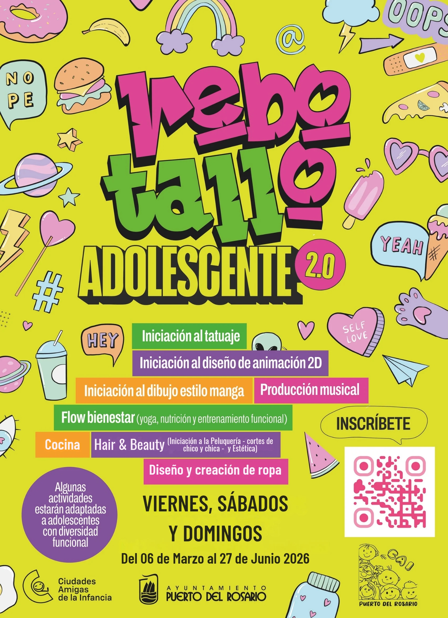 Este año, el proyecto regresa con una programación renovada que incluye talleres de iniciación al tatuaje, diseño de animación 2D, dibujo estilo manga, producción musical, “Flow Bienestar” (yoga, nutrición y entrenamiento funcional), cocina, iniciación a peluquería y estética, así como diseño y creación de ropa. Propuestas variadas, actuales y conectadas con las inquietudes de la juventud.