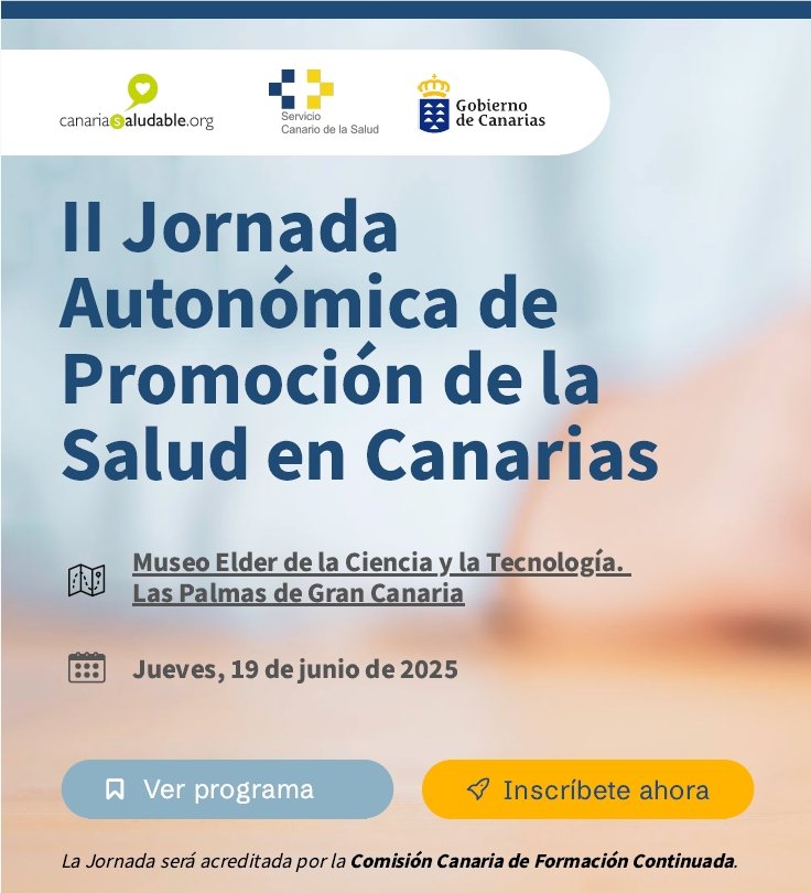 La Dirección General de Salud Pública del Servicio Canario de la Salud (SCS) organiza la II Jornada Autonómica de Promoción de la Salud en Canarias , que se celebrará el próximo jueves 19 de junio en el Museo Elder de la Ciencia y la Tecnología, en Las Palmas de Gran Canaria.