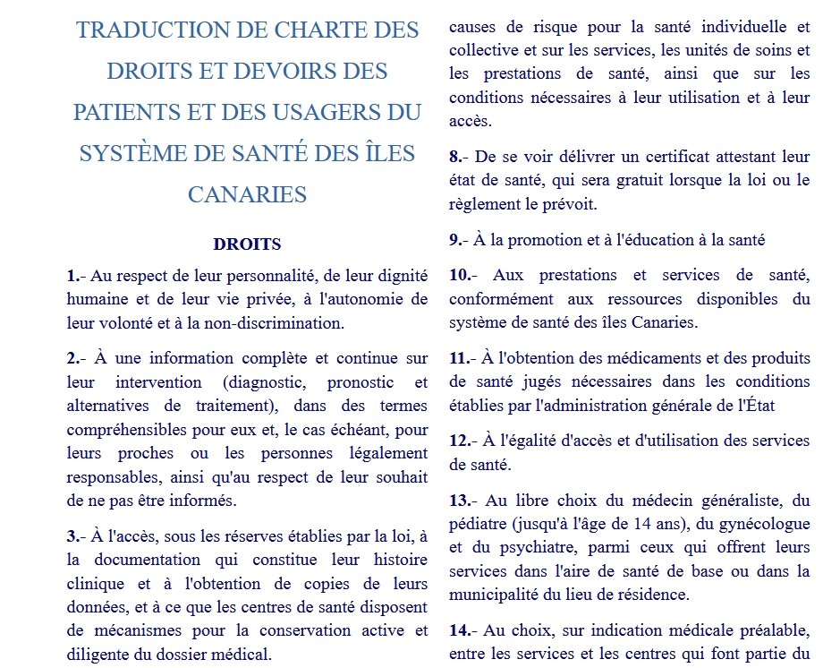 La Dirección General del Paciente y Cronicidad del Servicio Canario de la Salud (SCS), en colaboración con la Oficina de Defensa de los Derechos de los Usuarios Sanitarios de la Consejería de Sanidad (ODDUS) y la Fundación DISA, ha procedido a mejorar la accesibilidad de la ciudadanía al contenido de la Carta de los derechos y deberes de los pacientes y usuarios del sistema canario de la salud mediante su traducción a varios idiomas.