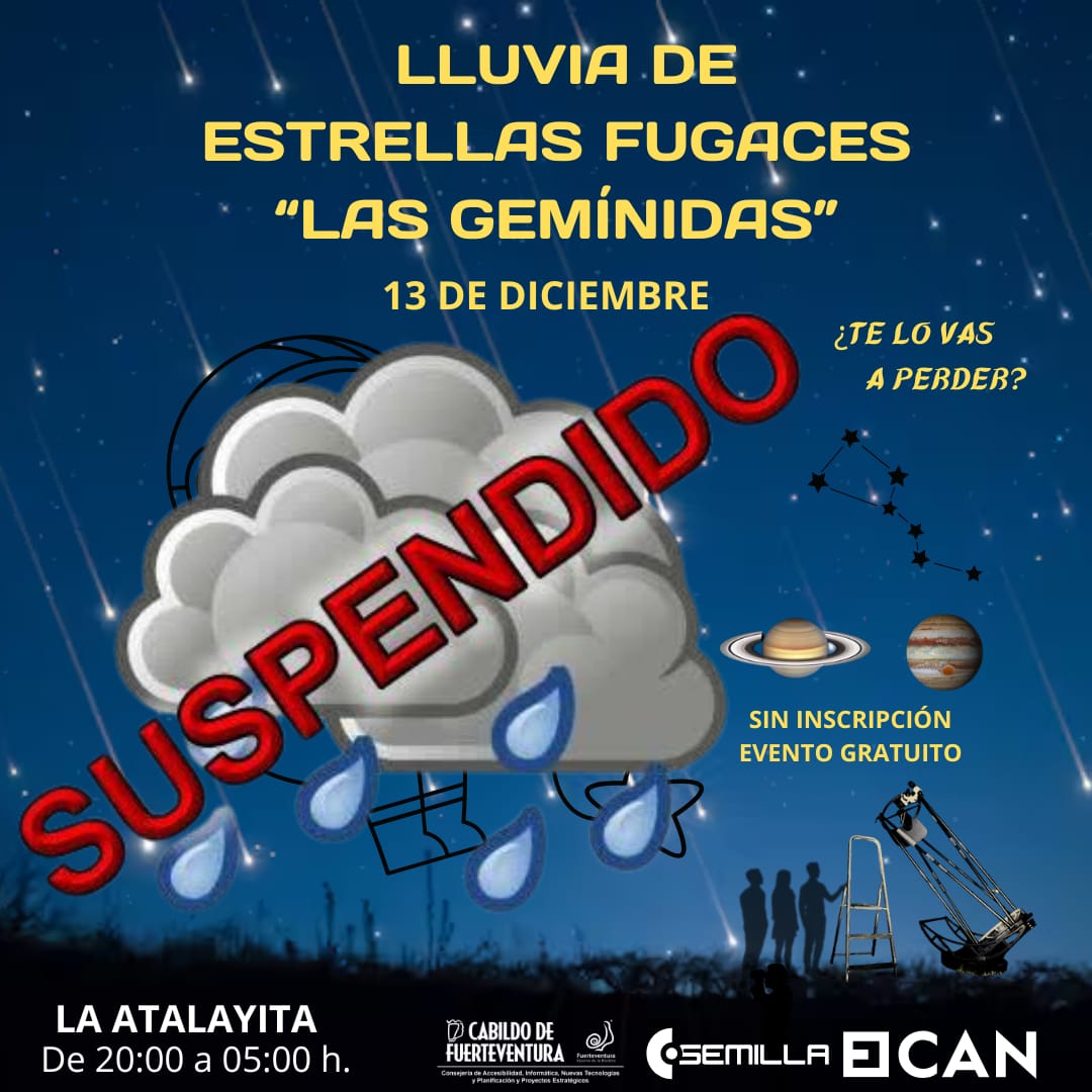 El Cabildo de Fuerteventura comunica que, debido a la situación de prealerta por lluvias y otros fenómenos meteorológicos adversos declarada por la Dirección General de Emergencias, queda suspendida la actividad de observación astronómica ‘Lluvia de estrellas fugaces Las Gemínidas’ programada para este sábado, 13 de diciembre. Se ruega disculpas por las posibles molestias ocasionadas.