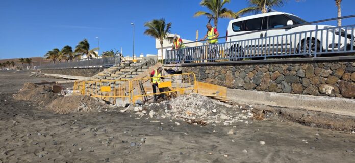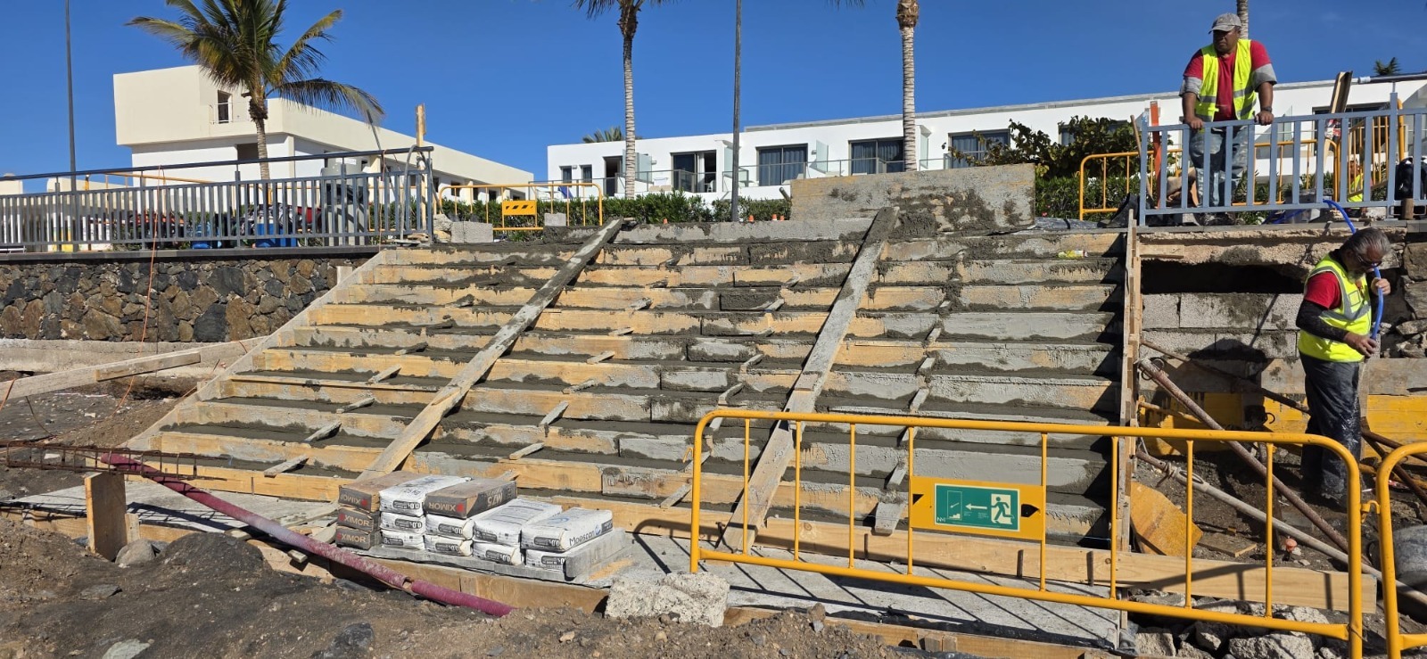 Los escombros de la escalera de Tarajalejo destruida por un temporal ya han sido retirados y desde esta semana se encuentra en ejecución la cimentación armada sobre el lecho de la playa de la estructura de la nueva escalera, con un hormigón especialmente formulado para resistir el ataque químico de sulfatos y cloruros presentes en el entorno marino.