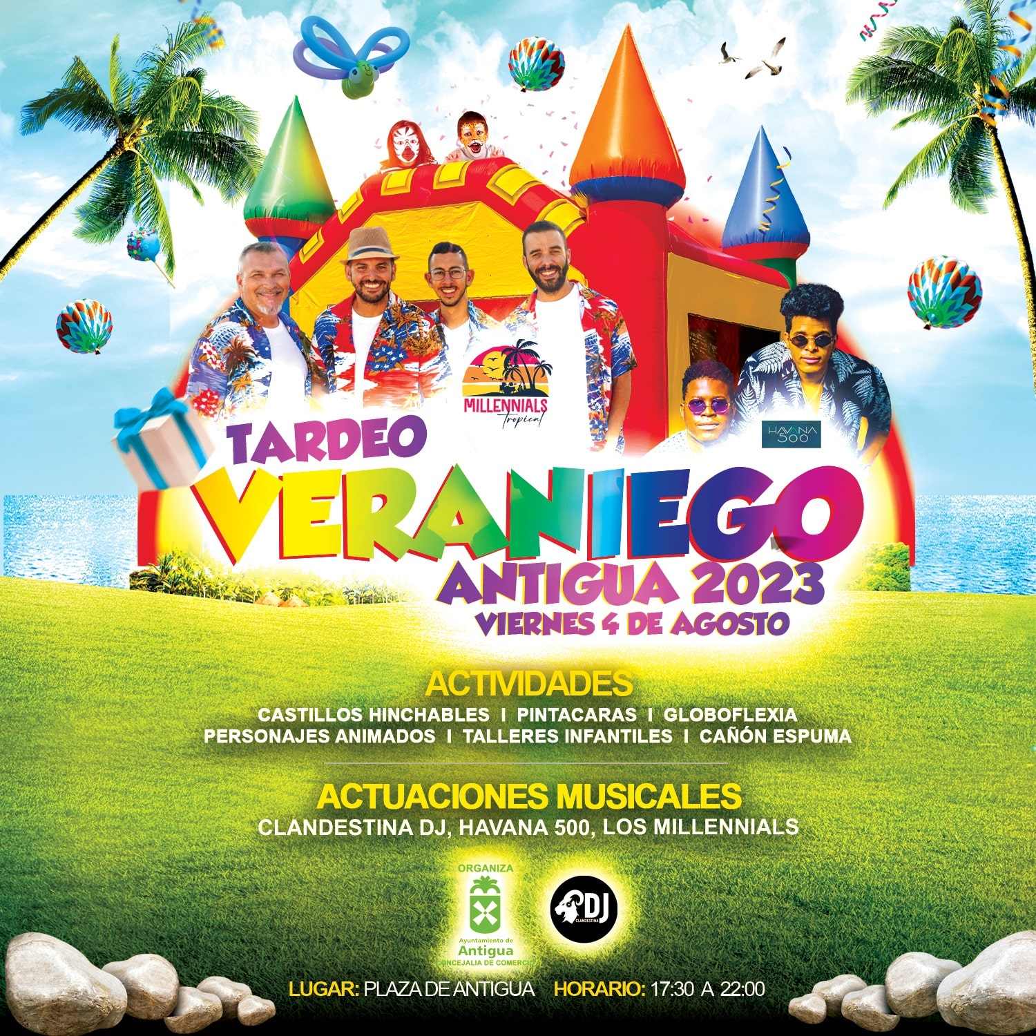 Ofreciendo una primera parte de juegos y talleres infantiles, añade el concejal, con música en directo, castillos hinchables, pintacaras, globoflexia o cañón de espuma, seguido de las actuaciones del DJ Clandestina, y los grupos Millennials y Havana 500 con un refrescante repertorio musical.