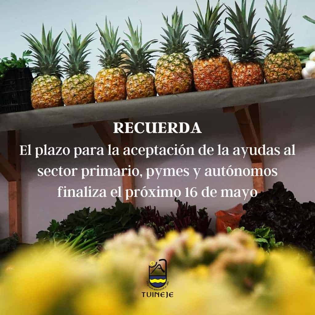 El Ayuntamiento de Tuineje recuerda a todas las personas que hayan resultado beneficiarias de la Convocatoria de Subvenciones para autónomos, microempresas y pequeñas empresas, así como de la Convocatoria de Subvenciones de Agricultura, Ganadería y Pesca, tienen de plazo hasta hoy, martes 16 de mayo, para realizar la aceptación de la ayuda para poder proceder a su abono.