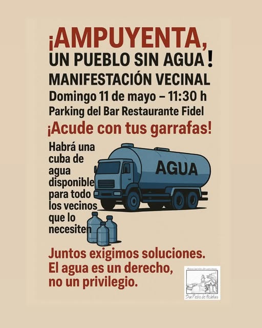 La localidad de Ampuyenta se prepara para una manifestación vecinal este domingo 11 de mayo a las 11:30 h en el parking del Bar Restaurante Fidel, en respuesta a la persistente falta de agua que afecta a sus vecinos.