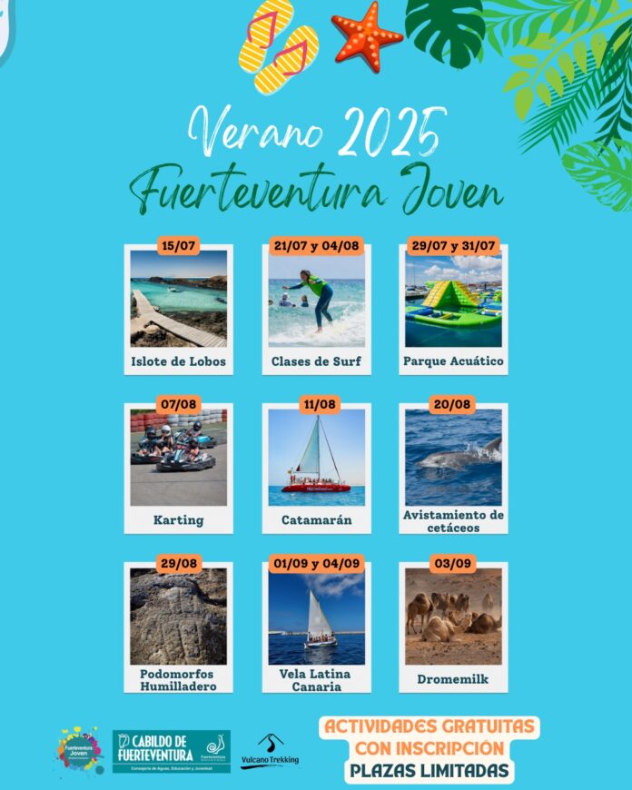 El Cabildo de Fuerteventura, a través de la Consejería de Aguas, Educación y Juventud, lanza otro año más su programa de actividades del programa Verano 2025, con el objetivo de ofrecer a los y las jóvenes de la Isla, con edades comprendidas entre los 12 y 30 años, una oferta atractiva de ocio activo, educativo y saludable durante el periodo estival.