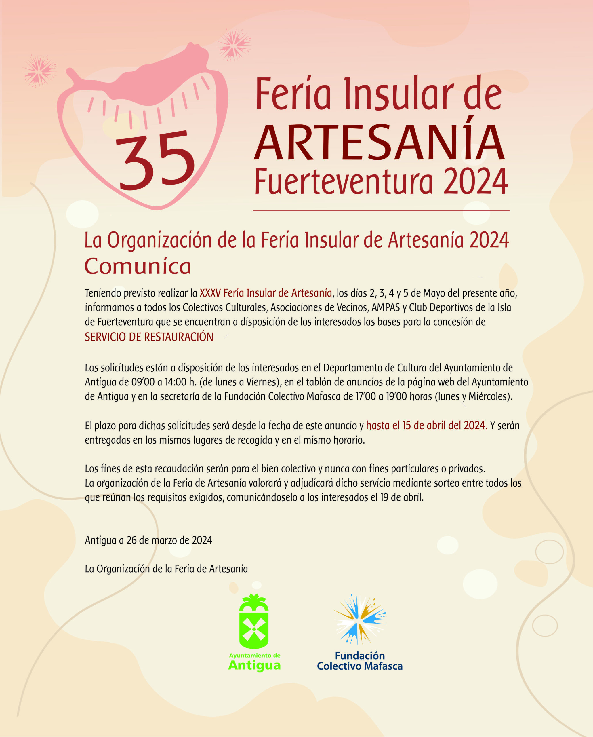 La Organización de la Feria Insular de Artesanía Fuerteventura 2024 valorará las solicitudes y adjudicará el Servicio de Restauración mediante sorteo entre todas las peticiones que reúnan los requisitos exigidos.