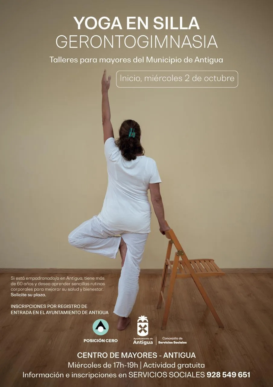Yoga en Silla se impartirá los miércoles por la tarde a partir del 2 de octubre, siendo necesaria la inscripción por Registro de Entrada en el Ayuntamiento de Antigua, Tenencia de Alcaldía en Caleta de Fuste, Departamento de Servicios Sociales o en la web www.ayto-antigua.es